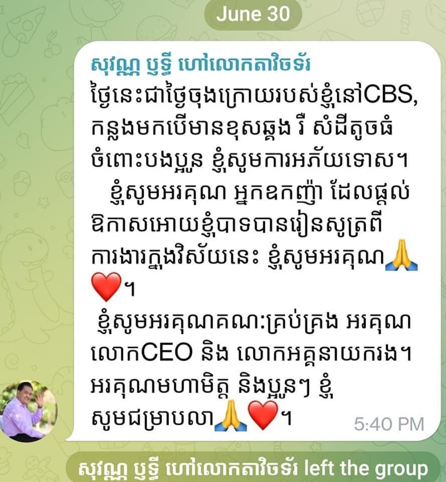 លោក សុវណ្ណរិទ្ធី ហៅតាវិចទ័រ បានលាឈប់ពី CTN ហើយតែមិនទាន់ដឹងមូលហេតុ