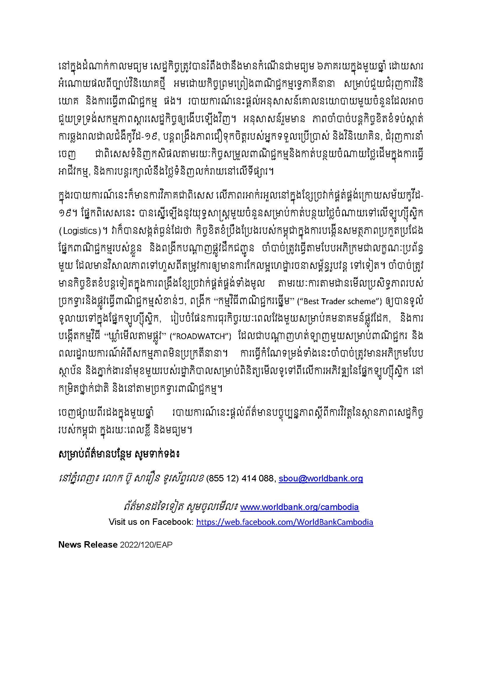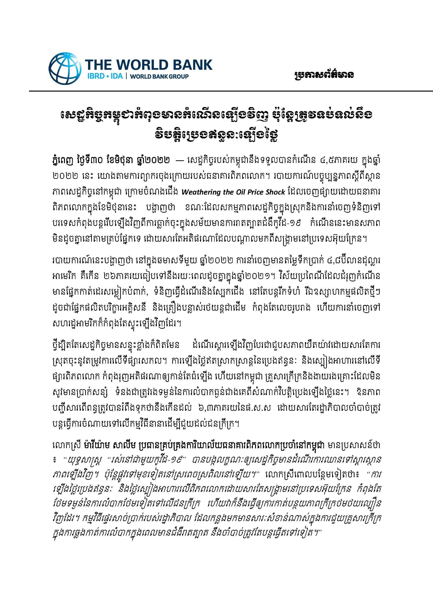 របាយការណ៍បច្ចុប្បន្នភាព ស្តីពីស្ថានភាពសេដ្ឋកិច្ចនៅកម្ពុជា ក្រោមចំណងជើង Weathering the Oil Price Shock ដែលចេញផ្សាយដោយធនាគារពិភពលោក ក្នុងខែមិថុនានេះ បង្ហាញថា ខណៈដែល សកម្មភាពសេដ្ឋកិច្ចក្នុងស្រុក និងការនាំចេញទំនិញទៅបរទេសកំពុងបន្តរើបឡើងវិញ ពីការធ្លាក់ចុះក្នុងសម័យមានការរាតត្បាតជំងឺកូវីដ-១៩ កំណើននេះ មានសភាពមិនដូចគ្នានៅតាមគ្រប់ផ្នែកទេ ដោយសារតែអតិផរណា ដែលបណ្តាលមកពីសង្គ្រាមនៅប្រទេសអ៊ុយក្រែន។