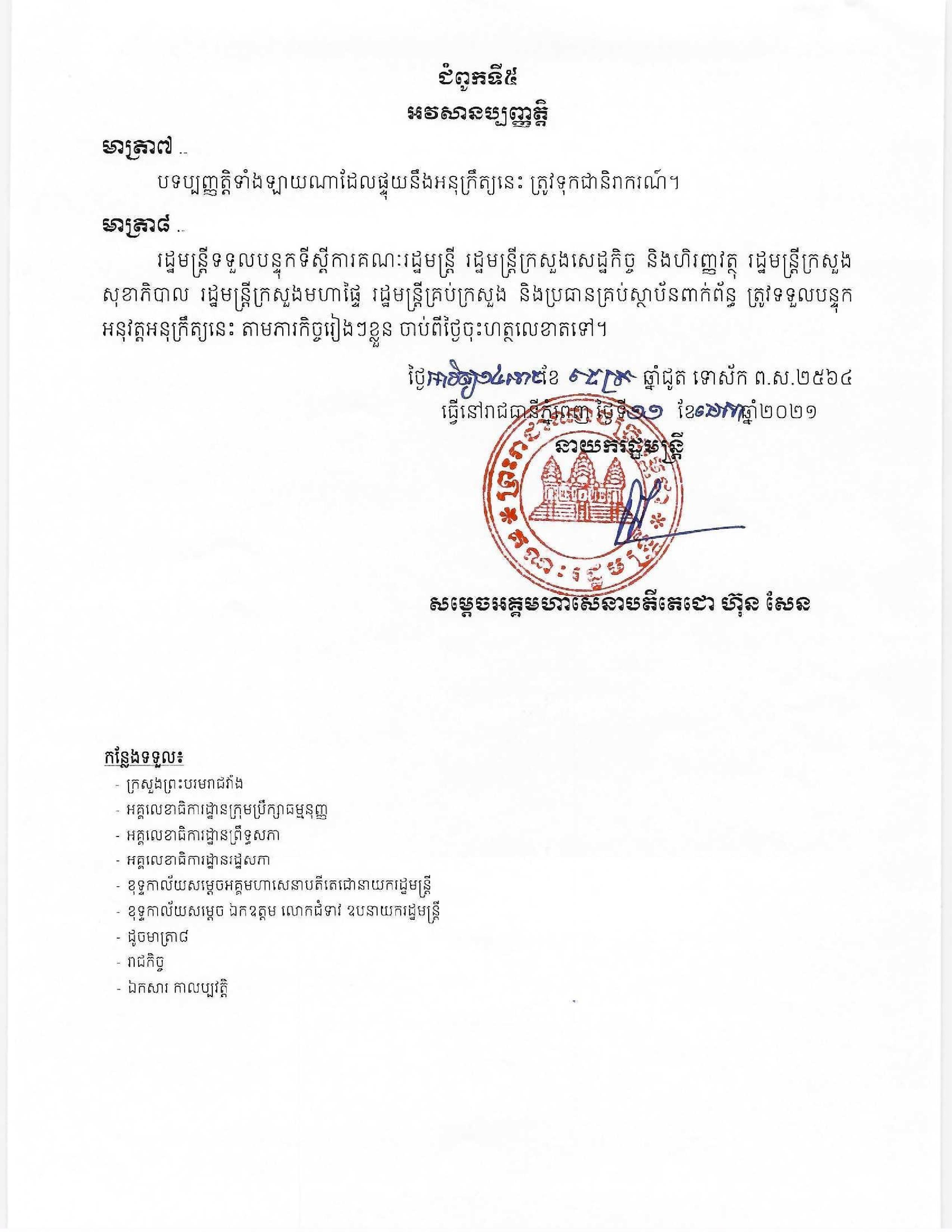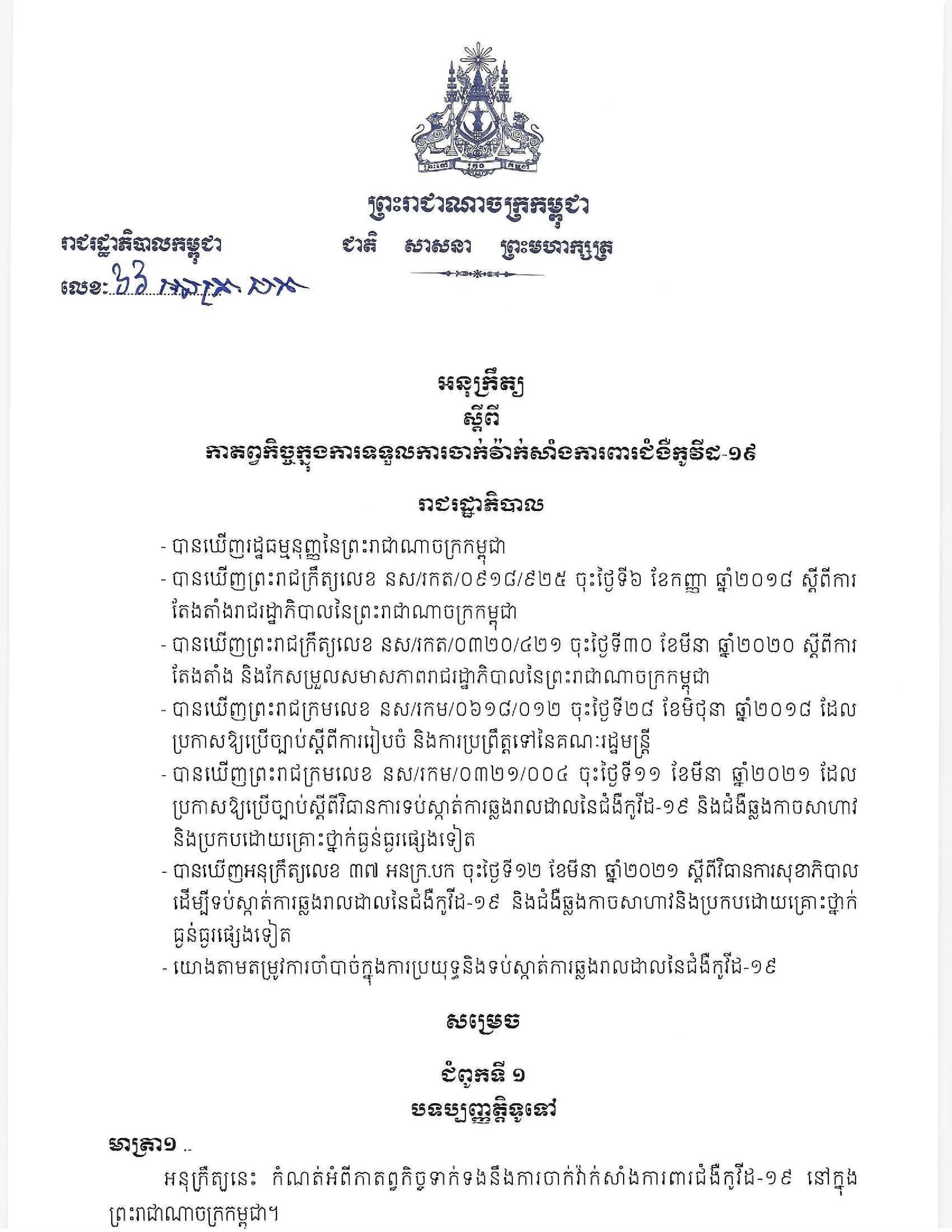 សូមរំលឹកថា កាលពីថ្ងៃទី១១ ខែមេសា ឆ្នាំ២០២១កន្លងទៅ សម្តេចតេជោ ហ៊ុន សែន ប្រមុខរាជរដ្ឋាភិបាលកម្ពុជា បានចេញអនុក្រឹត្យថ្មីមួយ ស្តីពីកាតព្វកិច្ចក្នុងការទទួលការចាក់វ៉ាក់សាំង ការពារជំងឺកូវីដ១៩។ អនុក្រឹត្យនេះមានគោលបំណងកំណត់ អំពីកាតព្វកិច្ចទាក់ទងនឹងការចាក់វ៉ាក់សាំងការពារជំងឺកូវីដ១៩ នៅក្នុងប្រទេសកម្ពុជា ហើយអនុក្រឹត្យនេះមានវិសាលភាព អនុវត្តចំពោះការចាក់វ៉ាក់សាំង នៅក្នុងប្រទេសកម្ពុជា ដើម្បីប្រយុទ្ធ និងទប់ស្កាត់ការឆ្លងរាលដាលនៃជំងឺកូវីដ១៩។