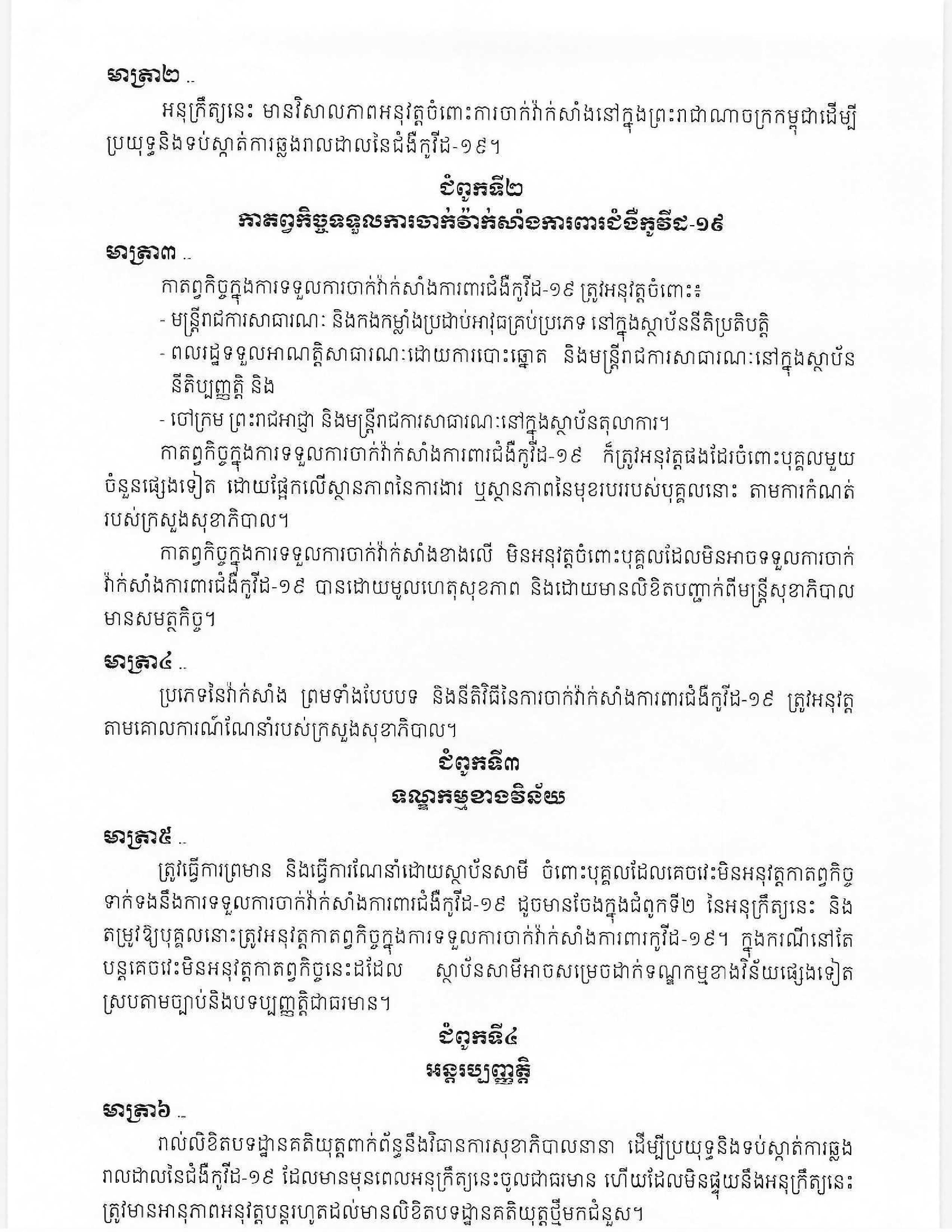 កាតព្វកិច្ចក្នុងការទទួលការចាក់វ៉ាក់សាំងខាងលើ មិនអនុវត្តចំពោះបុគ្គល ដែលមិនអាចទទួលការចាក់វ៉ាក់សាំងការពារជំងឺកូវីដ-១៩ បានដោយមូលហេតុសុខភាព និងដោយមានលិខិតបញ្ជាក់ពីមន្ត្រីសុខាភិបាលមានសមត្ថកិច្ច។ អនុក្រឹត្យបន្តថា ប្រភេទនៃវ៉ាក់សាំង ព្រមទាំងបែបបទ និងនីតិវិធីនៃការចាក់វ៉ាក់សាំងការពារជំងឺកូវីដ-១៩ ត្រូវអនុវត្ត តាមគោលការណ៍ណែនាំរបស់ក្រសួងសុខាភិបាល៕ផ្តល់សិទ្ធិដោយ៖ freshnews