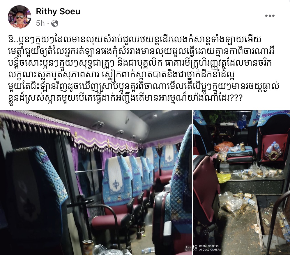 កាលពីពេលថ្មីៗនេះ មានការចែកររំលែកនៅក្នុងបណ្តាញសង្គមហ្វេសប៊ុក ទាក់ទងនឹងករណីហួសចិត្តមួយ ដែលបងប្អូនមួយចំនួនបានជួលរថយន្តក្រុងគេជិះទៅដើរលេងកំសាន្តរីករាយ ប៉ុន្តែបែរជាហូបចុករួចបោះចោលសំរាមផ្តេសផ្តាសពេញក្នុងរថយន្តក្រុង ដែលមហាជនឃើញហើយសម្តែងការហួសចិត្តយ៉ាងខ្លាំង ចំពោះទង្វើអសីលធម៌នោះ។
