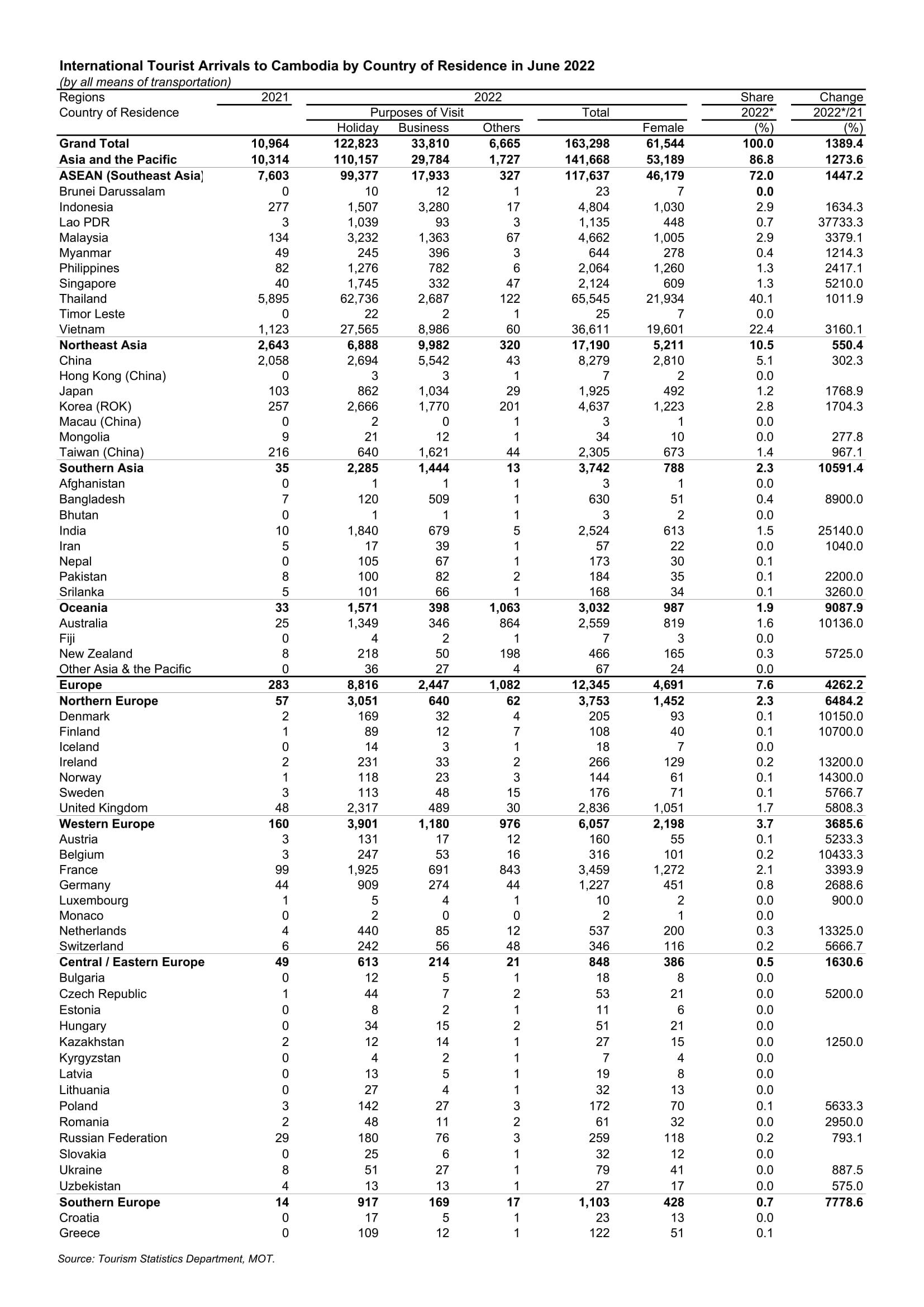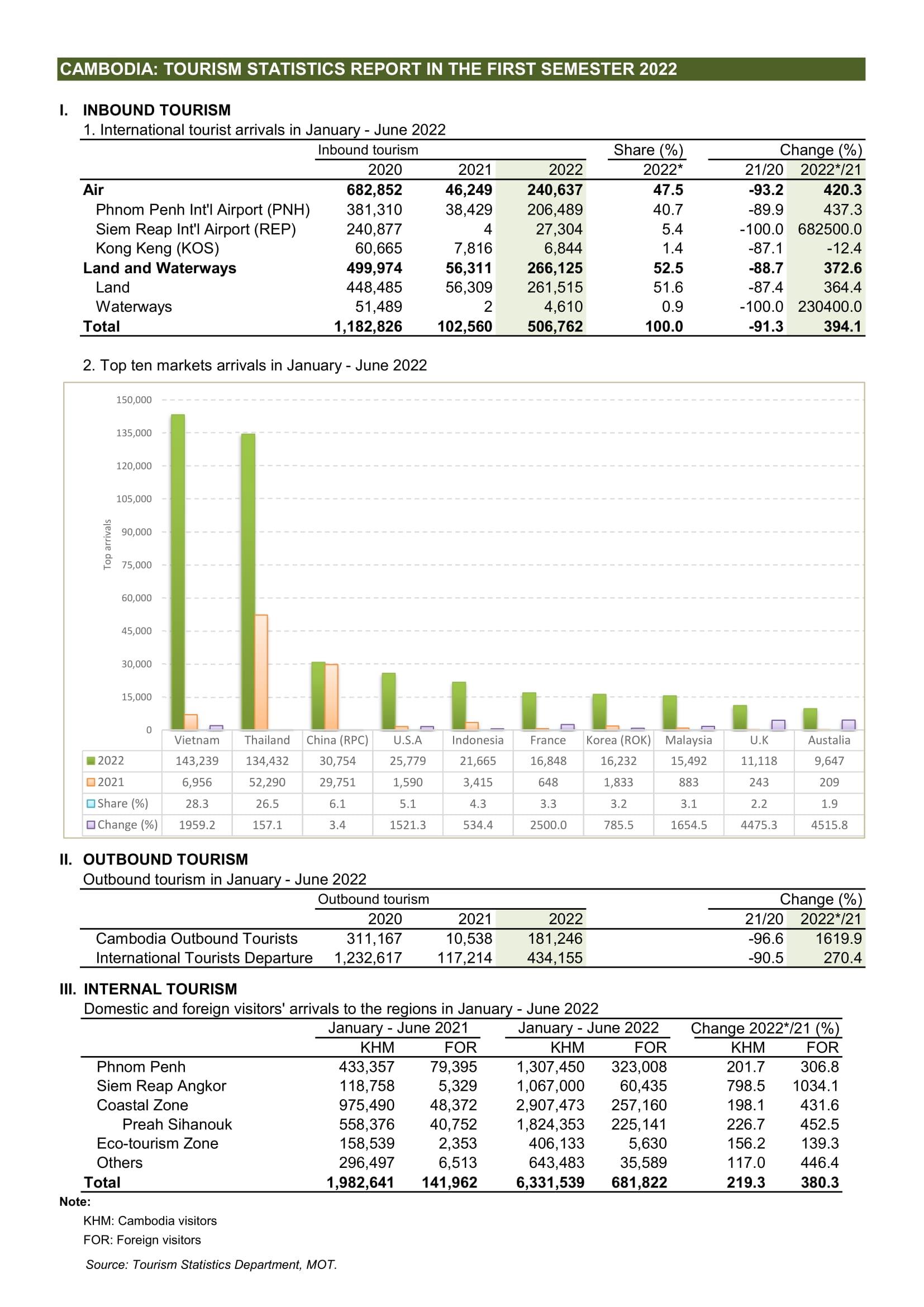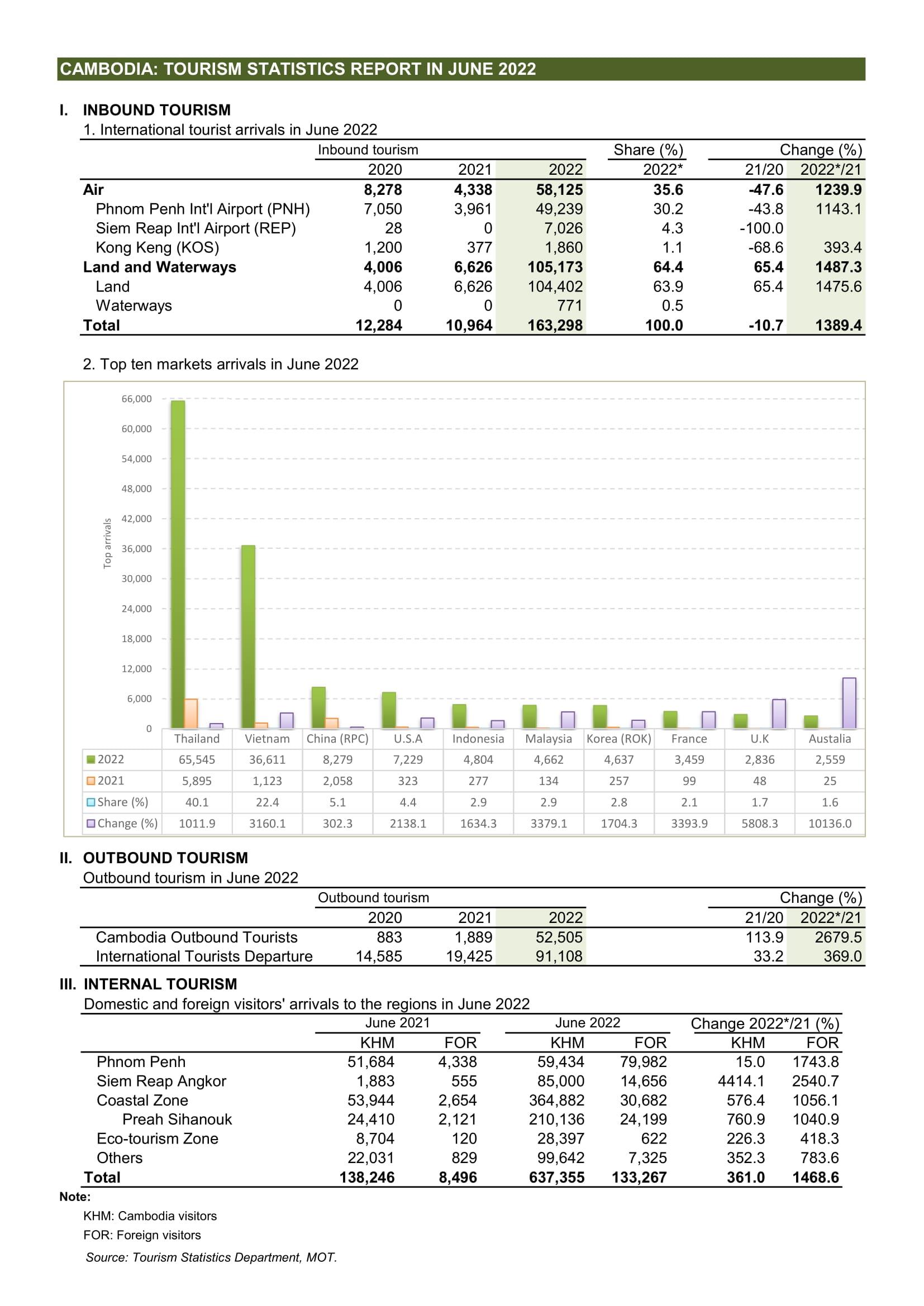 ដោយឡែក ក្នុងខែមិថុនា ឆ្នាំ២០២២ ទេសចរអន្តរជាតិចូលមកកម្ពុជាមានចំនួនសរុប១៦៣,២៩៨នាក់ កើនឡើង ១៣៨៩.៤% ធៀបរយៈពេលដូចគ្នានៅឆ្នាំ២០២១ និងថយចុះ -៦៣.៧% ធៀបរយៈពេលដូចគ្នានៅឆ្នាំ២០១៩ ក្នុងនោះចូលតាមផ្លូវអាកាសមានចំនួន៥៨,១២៥នាក់ កើនឡើង ១២៤០% ធៀបរយៈពេលដូចគ្នានៅឆ្នាំ២០២១ និងថយចុះ -៨២.៦% ធៀបរយៈពេលដូចគ្នាឆ្នាំ២០១៩ ចូលតាមផ្លូវគោកមានចំនួន១០៤,៤០២នាក់ កើនឡើង ១៤៧៥.៦% ធៀបរយៈពេលដូចគ្នានៅឆ្នាំ២០២១ និងថយចុះ -៦.៦% ធៀបរយៈពេលដូចគ្នានៅឆ្នាំ២០២១ និងចូលតាមផ្លូវទឹកមានចំនួន៧៧១នាក់។