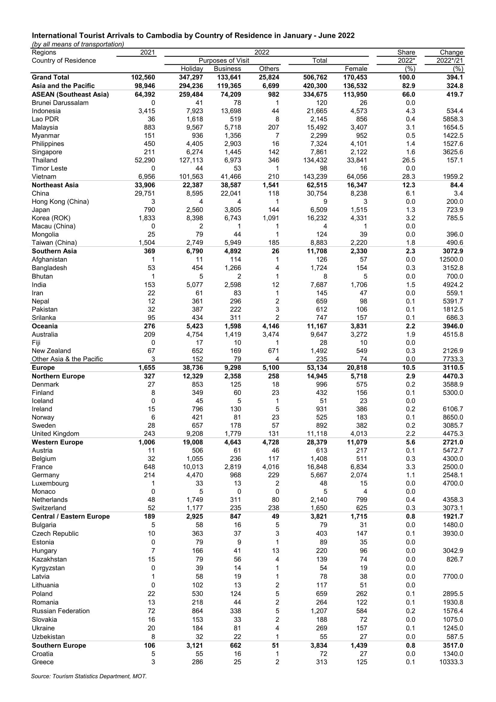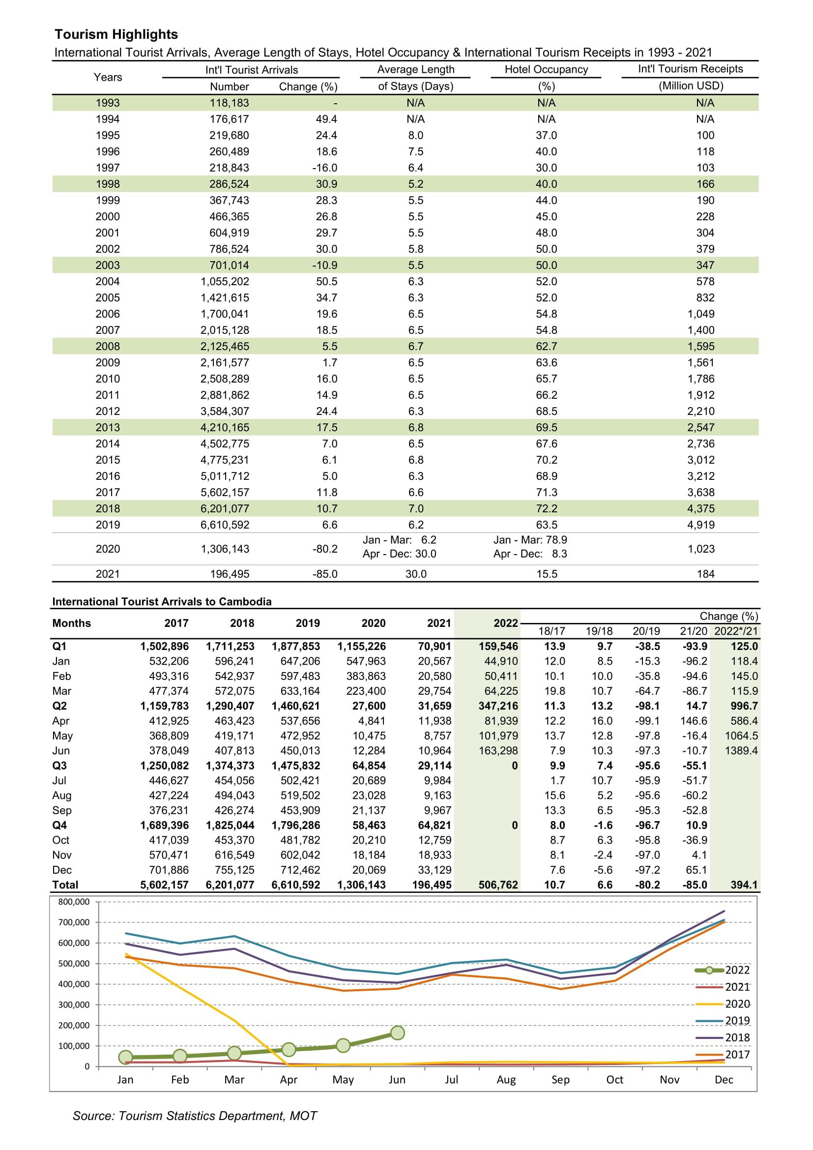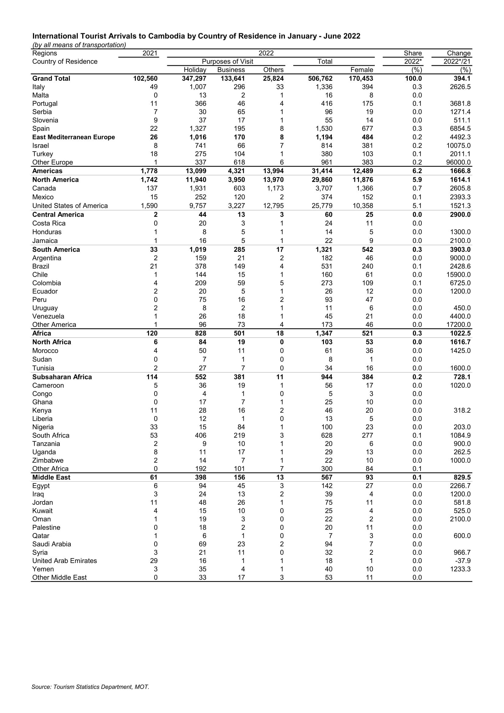 ដោយឡែក ក្នុងខែមិថុនា ឆ្នាំ២០២២ ទេសចរអន្តរជាតិចូលមកកម្ពុជាមានចំនួនសរុប១៦៣,២៩៨នាក់ កើនឡើង ១៣៨៩.៤% ធៀបរយៈពេលដូចគ្នានៅឆ្នាំ២០២១ និងថយចុះ -៦៣.៧% ធៀបរយៈពេលដូចគ្នានៅឆ្នាំ២០១៩ ក្នុងនោះចូលតាមផ្លូវអាកាសមានចំនួន៥៨,១២៥នាក់ កើនឡើង ១២៤០% ធៀបរយៈពេលដូចគ្នានៅឆ្នាំ២០២១ និងថយចុះ -៨២.៦% ធៀបរយៈពេលដូចគ្នាឆ្នាំ២០១៩ ចូលតាមផ្លូវគោកមានចំនួន១០៤,៤០២នាក់ កើនឡើង ១៤៧៥.៦% ធៀបរយៈពេលដូចគ្នានៅឆ្នាំ២០២១ និងថយចុះ -៦.៦% ធៀបរយៈពេលដូចគ្នានៅឆ្នាំ២០២១ និងចូលតាមផ្លូវទឹកមានចំនួន៧៧១នាក់។