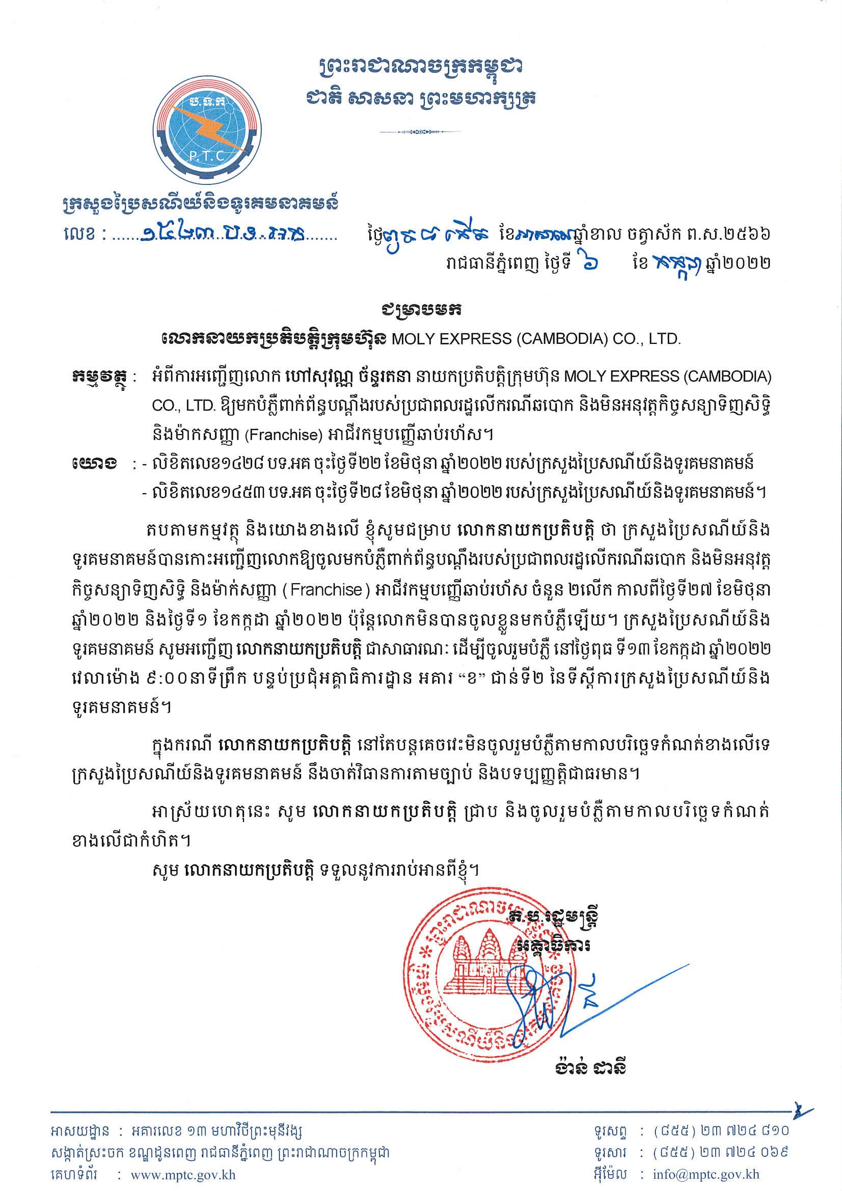 ក្រសួងប្រៃសណីយ៍ និងទូរគមនាគមន៍ អញ្ជើញនាយកប្រតិបត្តិក្រុមហ៊ុន MOLY EXPRESS ឲ្យមកបំភ្លឺពាក់ព័ន្ធករណីឆបោក និងមិនអនុវត្តកិច្ចសន្យា