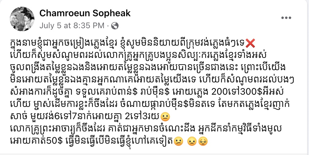 កញ្ញា ចំរើន សុភ័ក្ត្រ បានរៀបរាប់ឲ្យដឹងថា៖ «ក្នុងនាមខ្ញុំជាអ្នកចម្រៀងភ្លេងខ្មែរ ខ្ញុំសូមមិននិយាយពីក្រុមវង់ភ្លេងធំៗទេ❌ ហើយក៏សូមសំណូមពរដល់លោកគ្រូអ្នកគ្រូបងប្អូនសិល្បៈករភ្លេងខ្មែរទាំងអស់ ចូលពង្រឹងតម្លៃខ្លួនឯងនិងអោយតម្លៃខ្លួនឯងអោយបានច្រេីនជាងនេះ ព្រោះបើយើងមិនអោយតម្លៃខ្លួនឯងគ្មានអ្នកណាគេអោយតម្លៃយើងទេ ហើយក៏សំណូមពរដល់បងៗសំអាងការក៏ដូចគ្នា ទទួលគេរាប់ពាន់$ រាប់ម៉ឺន$ អោយភ្លេង 200ទៅ300$អីអស់ហើយ ម្ចាស់ដេីមការខ្លះក៏ចឹងដែរ​ ចំណាយផ្ការាប់ម៉ឺន$មិនតទេ​ តែមកតភ្លេងខ្មែរញាក់សាច់​ មួយវង់6ទៅ7នាក់អោយ​គ្នា 2ទៅ3រយ😐 លោកគ្រូព្រះអាចារ្យក៏ចឹងដែរ គាត់ជាអ្នកមានចំណេះដឹង អ្នកដឹកនាំកម្មវិធីទាំងមូល អោយគាត់50$ ធ្វើមិនធ្វើបើមិនធ្វើខ្ញុំហៅគេទៀត😕 ☹️😔»៕ ផ្តល់សិទ្ធិដោយ៖ ខ្មែរណូត