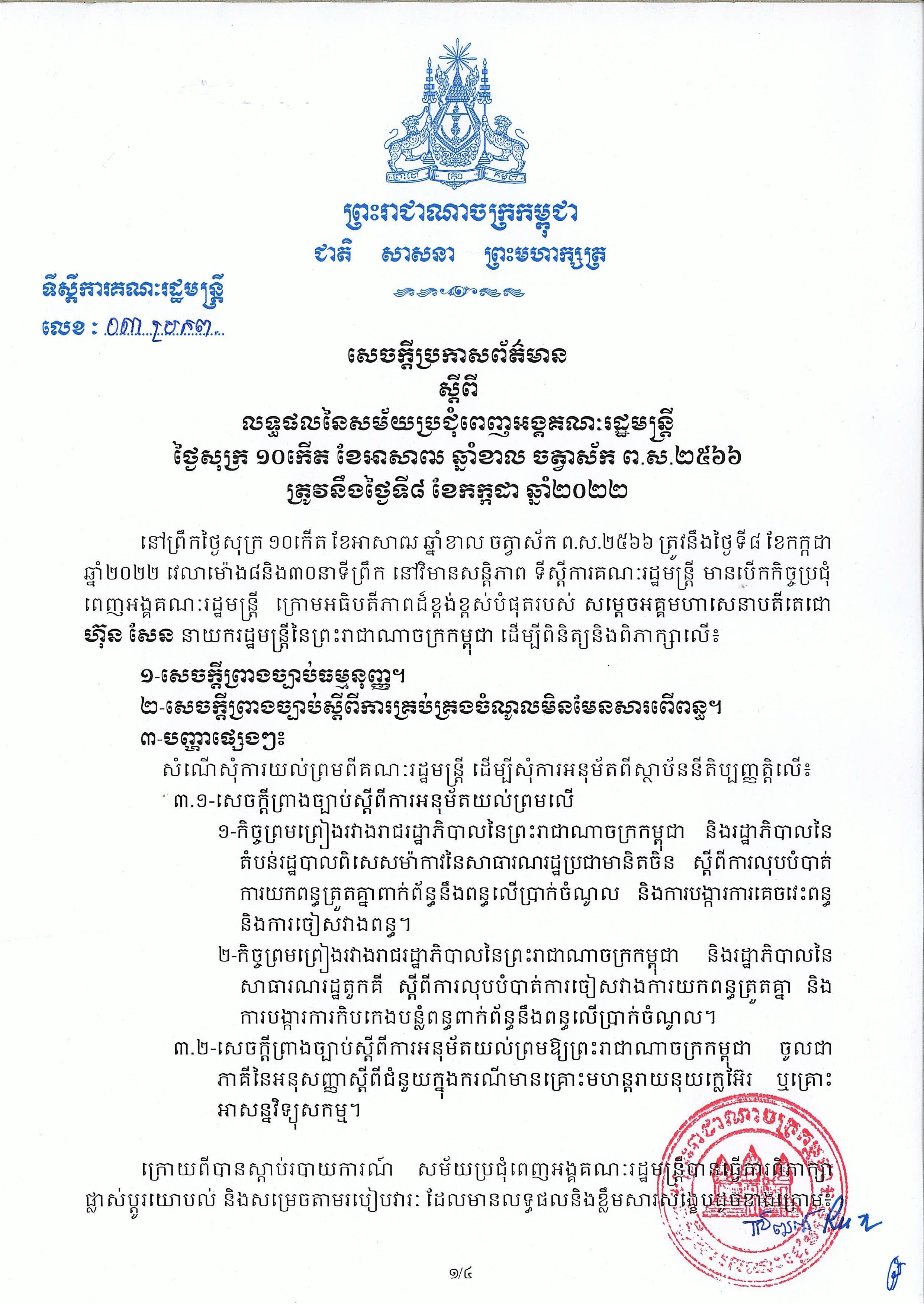 យោងតាមលទ្ធផលនៃកិច្ចប្រជុំពេញអង្គគណៈរដ្ឋមន្រ្តី នៅថ្ងៃទី០៨ ខែកក្កដា ឆ្នាំ២០២២ នាទីស្តីការគណៈរដ្ឋមន្រ្តី សម្តេចតេជោ ហ៊ុន សែន បានបញ្ជាក់យ៉ាងដូច្នេះថា «រាជរដ្ឋាភិបាល បានឯកភាពឱ្យរថយន្តចង្កូតស្ដាំ ដែលមានស្រាប់ក្នុងព្រះរាជាណាចក្រកម្ពុជា ចរាចរជាប្រក្រតីដោយពុំចាំបាច់ធ្វើការកែពីចង្កូតស្ដាំទៅចង្កូតឆ្វេង ប៉ុន្តែតម្រូវឱ្យម្ចាស់រថយន្តទាំងនោះ ត្រូវទៅបង់ពន្ធជាដាច់ខាត ចំពោះអ្នកដែលមិនទាន់បានបង់ពន្ធ ហើយអ្នកដែលកក់ប្រាក់ពន្ធ ត្រូវទៅបង់បង្រ្គប់ប្រាក់ពន្ធ ដើម្បីទទួលបានស្លាកលេខប្រើប្រាស់ ដោយទុកឱសានវាទ រយៈពេល៣ខែទៀត គិតចាប់ពីថ្ងៃទី៦ ខែកក្កដា ឆ្នាំ២០២២»។