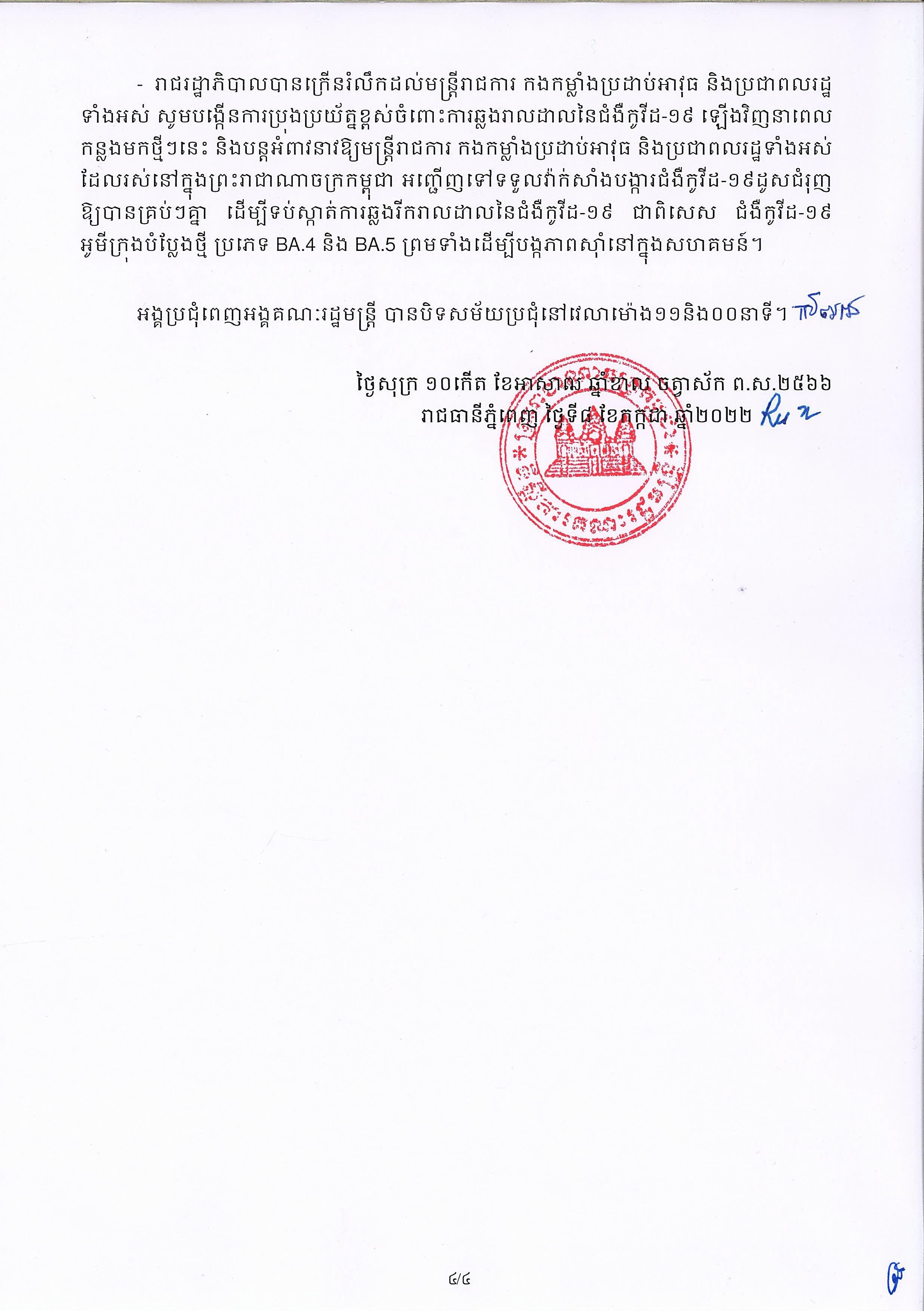 បន្ថែមលើនេះ ប្រមុខដឹកនាំរាជរដ្ឋាភិបាល បានណែនាំដល់រដ្ឋបាលរាជធានី-ខេត្ត កងកម្លាំងប្រដាប់អាវុធ និងសមត្ថកិច្ចពាក់ព័ន្ធ ត្រូវចាត់វិធានការតាមផ្លូវច្បាប់ឱ្យបានម៉ឺងម៉ាត់បំផុត ចំពោះគ្រប់បុគ្គលឬនីតិបុគ្គល ទាំងឡាយណាដែលបង្កភាពអនាធិបតេយ្យលើដងផ្លូវ ឬប្រមូលផ្តុំតវ៉ាធ្វើបាតុកម្មបិទផ្លូវសាធារណៈដោយខុសច្បាប់។