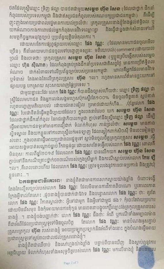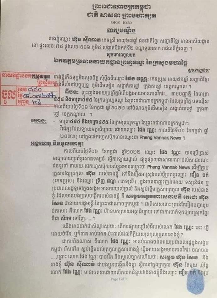 លោកជំទាវ ហ៊ុន ស៊ីណាត សម្រេចប្ដឹង លោក ផែង វណ្ណៈ ពីបទញុះញង់បង្កឲ្យមានភាពវឹកវរ