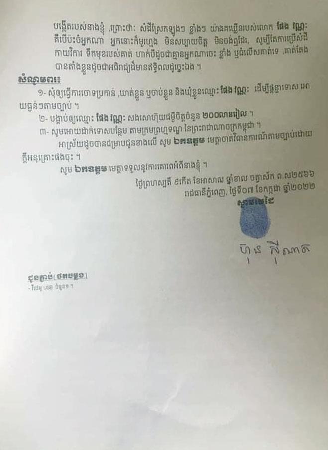 តាមរយៈពាក្យបណ្ដឹងនេះ លោកជំទាវ ហ៊ុន សុីណាត សូមសំណូមពរ៣ចំណុច៖