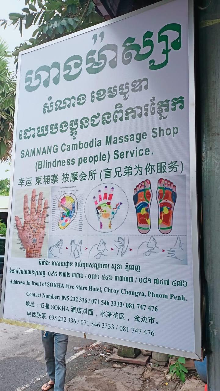 ហាងម៉ាស្សាមានឈ្មោះថា «សំណាង ខេមបូឌា» គឺជាកន្លែងម៉ាស្សាផ្តល់សេវាដោយជនពិការភ្នែក។ ការអញ្ជើញចូលសួរសុខទុក្ខជនពិការនៅក្នុងហាងម៉ាស្សានេះ មិនមានបានរៀបចំទុកជាមុននោះឡើយ ពោលជាការអញ្ជើញចូលសួរសុខទុក្ខដោយមិនបានព្រៀងទុក។