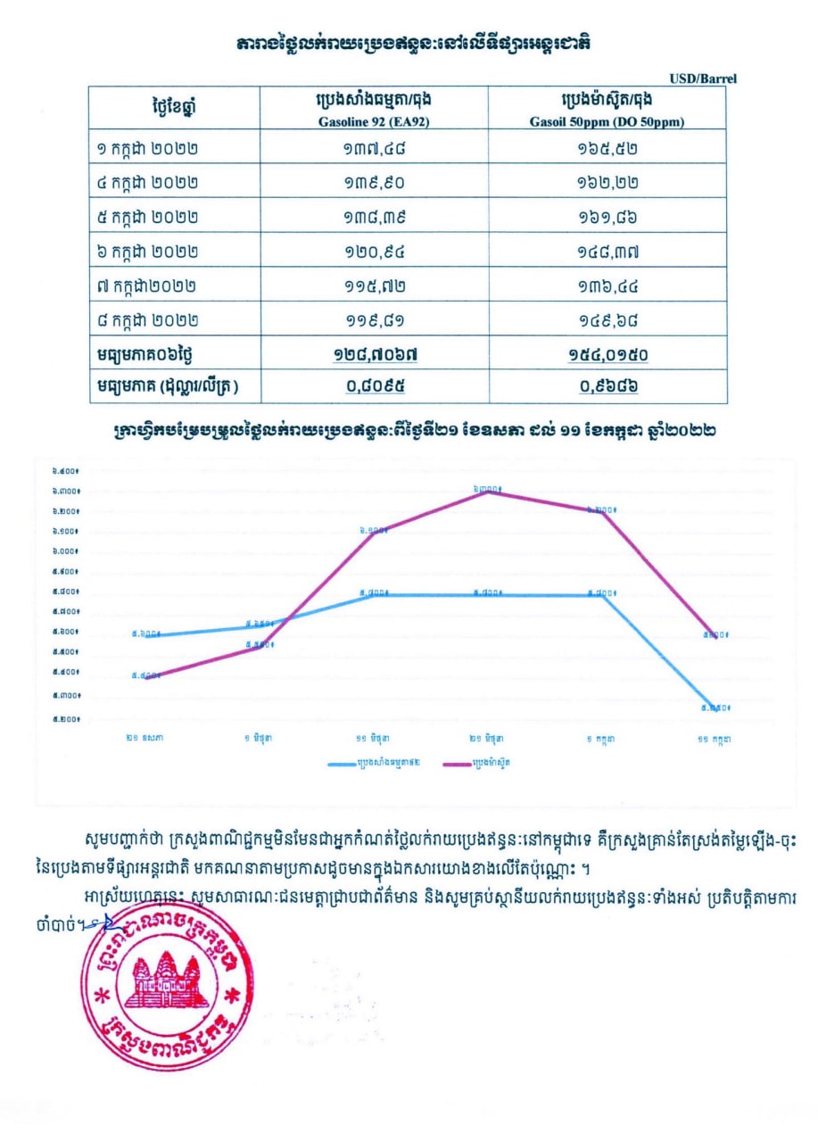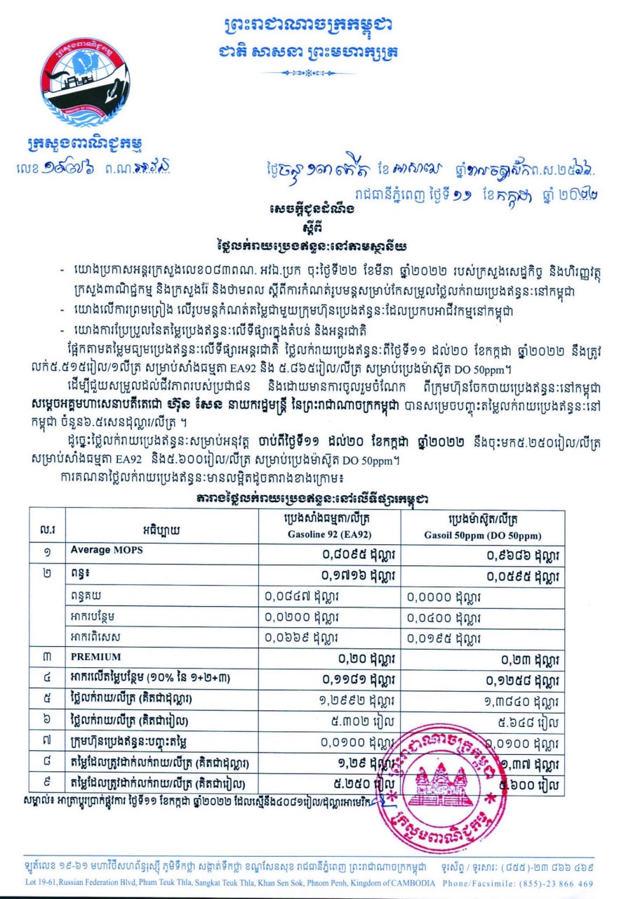 (ភ្នំពេញ)៖ ក្រសួងពាណិជ្ជកម្ម នៅថ្ងៃទី១១ ខែកក្កដា ឆ្នាំ២០២២នេះ បានចេញសេចក្តីជូនដំណឹង ប្រកាសពីតម្លៃលក់រាយប្រេងឥន្ធនៈ នៅតាមស្ថានីយនានាដោយចាប់ពីថ្ងៃនេះដល់ថ្ងៃទី២០ ខែកក្កដា ឆ្នាំ២០២២ ត្រូវលក់សាំងធម្មតាតម្លៃ ៥,២៥០រៀល និងម៉ាស៊ូតត្រូវលក់ ៥,៦០០រៀលក្នុង១លីត្រ៕