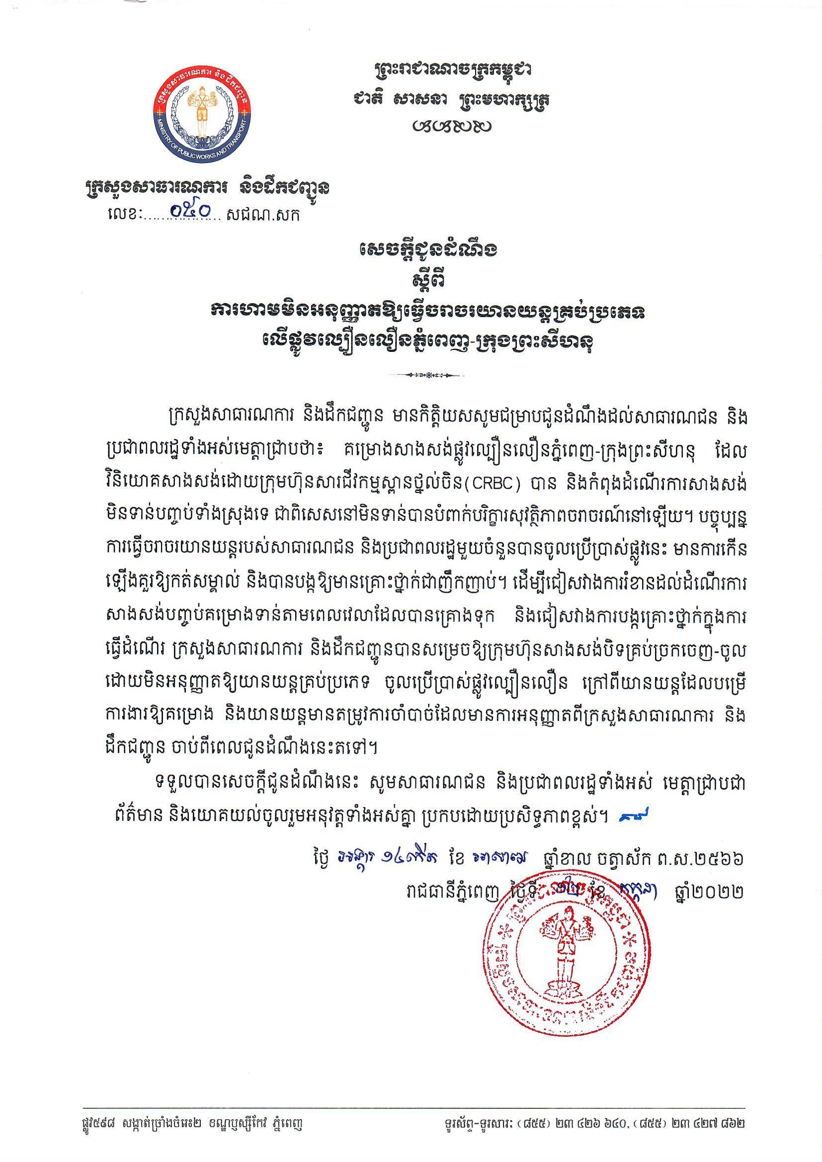 ក្នុងសេចក្តីជូនដំណឹងរបស់ក្រសួងសាធារណការ និងដឹកជញ្ជូន នៅថ្ងៃទី១២ ខែកក្កដា នេះ បានគូសបញ្ជាក់ថា ដើម្បីចៀសវាងការរំខានដល់ដំណើរការសាងសង់បញ្ចប់គម្រោងទាន់ពេលវេលាបានគ្រោងទុក និងចៀសវាងការបង្កគ្រោះថ្នាក់ក្នុងការធ្វើដំណើរ ក្រសួង បានសម្រេចឱ្យក្រុមហ៊ុនសាងសង់បិទគ្រប់ច្រកចេញ-ចូល ដោយមិនអនុញ្ញាតឱ្យយានយន្តគ្រប់ប្រភេទ ចូលប្រើផ្លូវល្បឿនលឿន ក្រៅពីយានយន្តដែលបម្រើឱ្យគម្រោង និងយានយន្តមានតម្រូវការចាំបាច់ ដែលមានការអនុញ្ញាតពីក្រសួងសាធារណការ និងដឹកជញ្ជូននោះឡើយ៕ ផ្តល់សិទ្ធិដោយ៖ freshnews
