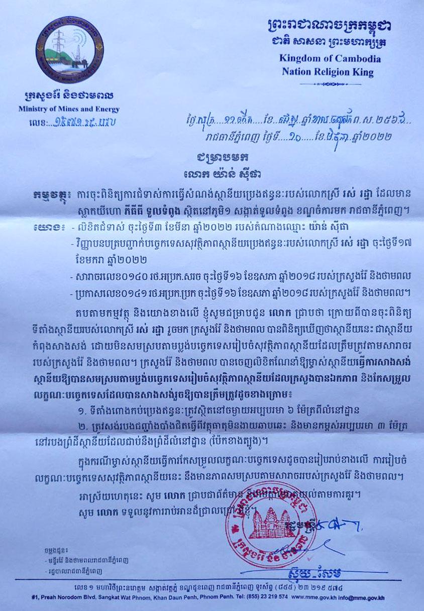 នៅក្នុងលិខិតរបស់ខ្លួន ក្រសួងរ៉ែបានបញ្ជាក់ថា «ក្រោយពីបានចុះពិនិត្យ ទីតាំងស្ថានីយរបស់លោកស្រី រស់ រដ្ឋា រួចមក ក្រសួងរ៉ែ និងថាមពល បានពិនិត្យឃើញថាស្ថានីយនេះ ជាស្ថានីយកំពុងសាងសង់ ដោយមិនសមស្រប តាមប្លង់បច្ចេកទេសរៀបចំសុវត្ថិភាពស្ថានីយដែលត្រឹមត្រូវតាមសារាចរ របស់ក្រសួងរ៉ែ និងថាមពល»។