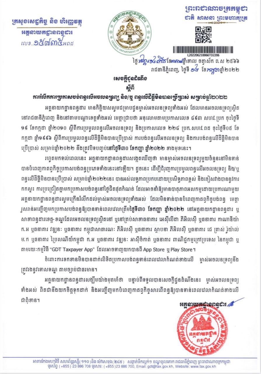 អគ្គនាយកដ្ឋានពន្ធដារ សូមក្រើនរំលឹកដល់ម្ចាស់អចលនទ្រព្យទាំងអស់ ដែលមិនទាន់បានបំពេញកាតព្វកិច្ចបង់ពន្ធ មេត្តារួសរាន់អញ្ជើញមកប្រកាសបង់ពន្ធ ឲ្យបានទាន់ពេលវេលាត្រឹមថ្ងៃទី៣០ ខែកញ្ញា ឆ្នាំ២០២២ នៅអគ្គនាយកដ្ឋានពន្ធដារ ឬសាខាពន្ធដារខេត្ត-ខណ្ឌ ឬតាមរយៈកម្មវិធី «GDT Taxpayer App» ដែលអាចទាញយកបានពី App Store ឬ Play Store។