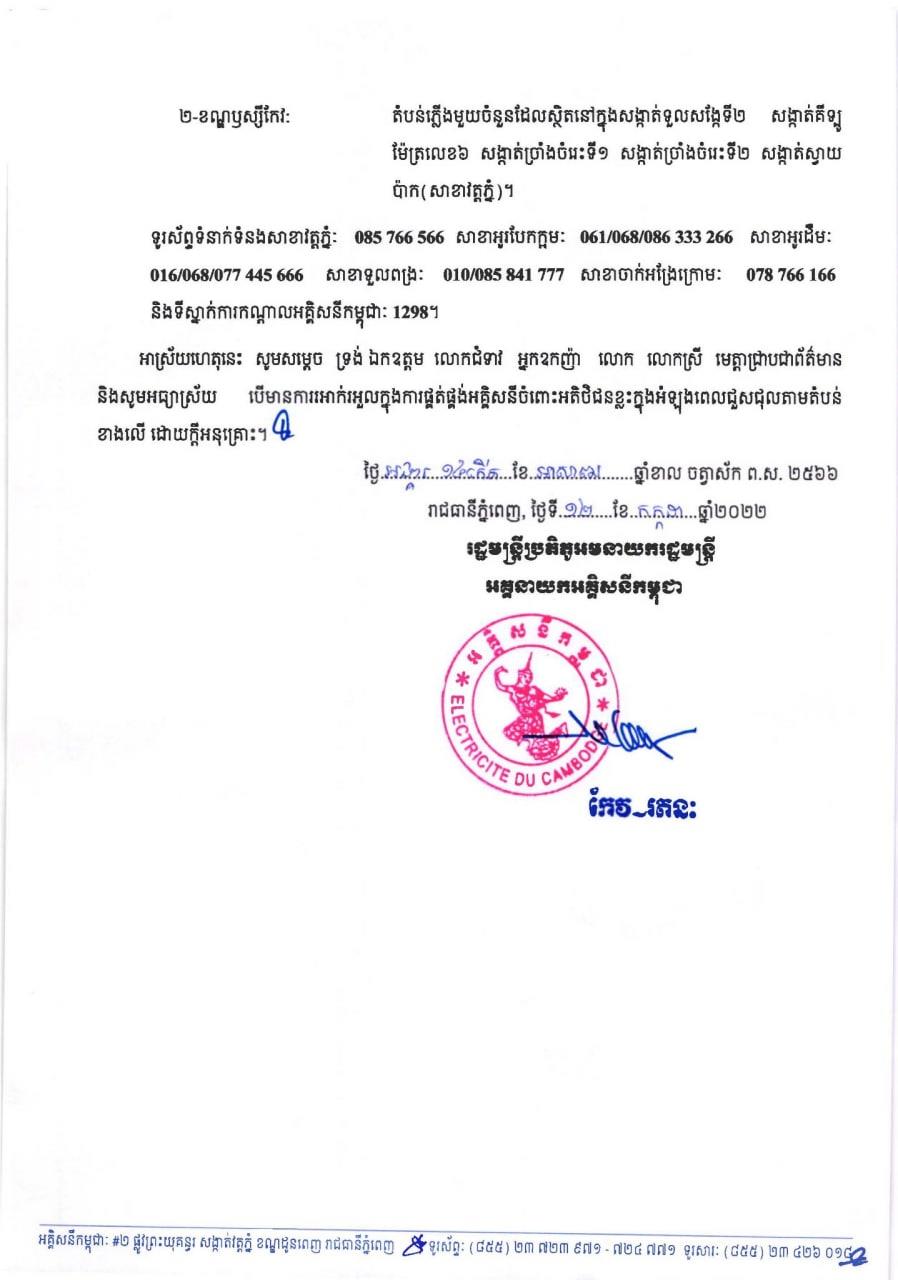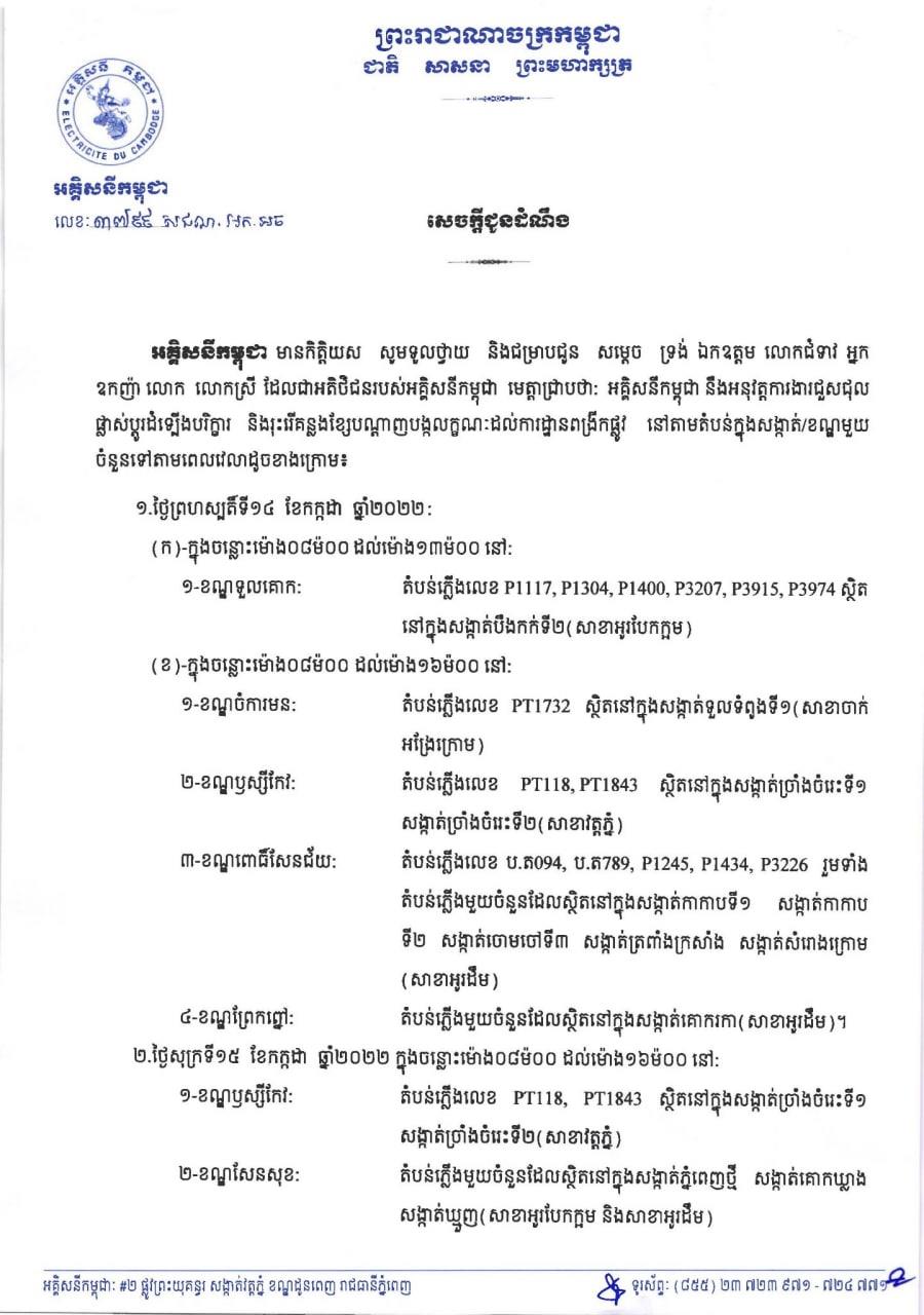 សូមអានសេចក្តីជូនដំណឹង របស់អគ្គិសនីកម្ពុជា ដូចខាងក្រោម៖