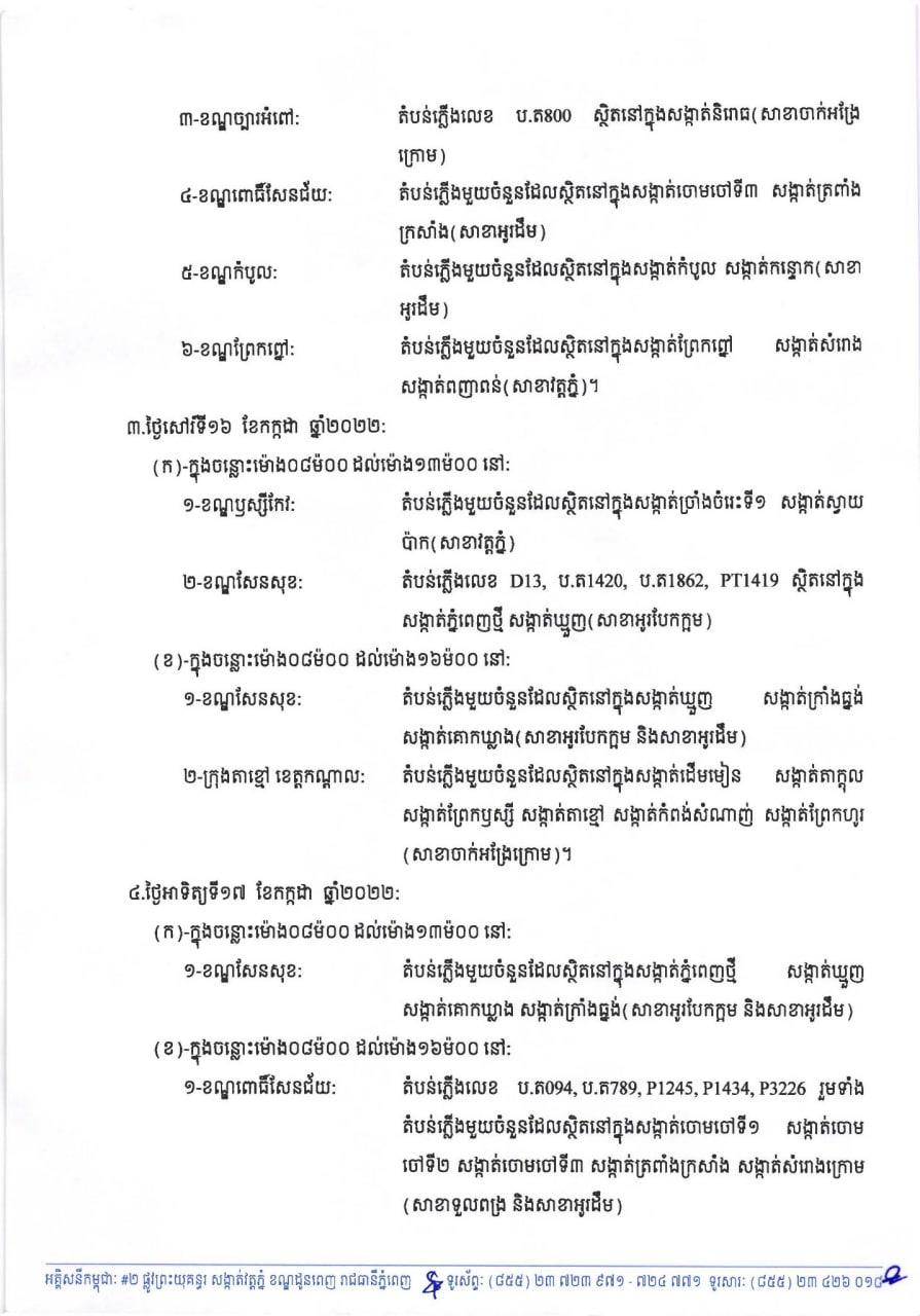 EDC ជូនដំណឹងពីការរអាក់រអួលចរន្ត ចាប់ពីថ្ងៃនេះដល់ថ្ងៃទី១៧ ខែកក្កដា ដើម្បីរុះរើគន្លង ខ្សែបណ្តាញ ផ្លាស់ប្តូរ តម្លើងបរិក្ខារ ងាយស្រួលដល់ការដ្ឋានពង្រីកផ្លូវ