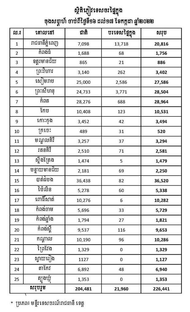 (ភ្នំពេញ)៖ លោក ថោង ខុន រដ្ឋមន្ត្រីក្រសួងទេសចរណ៍ នាថ្ងៃទី១៨ ខែកក្កដា ឆ្នាំ២០២២នេះ បានបង្ហាញស្ថិតិប្រចាំសប្តាហ៍ថ្ងៃទី១៦-១៧ ខែកក្កដា ឆ្នាំ២០២២ មានភ្ញៀវទេសចរចេញដើរកម្សាន្តចំនួន ២២៦,៤៤១ នាក់ ក្នុងនោះភ្ញៀវជាតិ ២០៤,៤៨១នាក់ ភ្ញៀវបរទេសផ្ទៃក្នុង ២១,៩៦០នាក់។