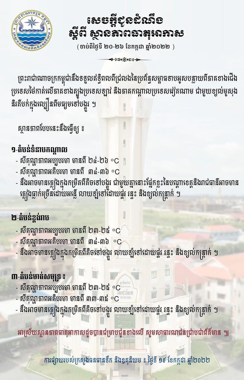 (ភ្នំពេញ)៖ ក្រសួងធនធានទឹក និងឧតុនិយម បានចេញសេចក្តីជូនដំណឹង ស្តីពីស្ថានភាពធាតុអាកាសនៅកម្ពុជា ចាប់ពីថ្ងៃនេះ ដល់ថ្ងៃទី២៦ ខែកក្កដា ឆ្នាំ២០២២។
