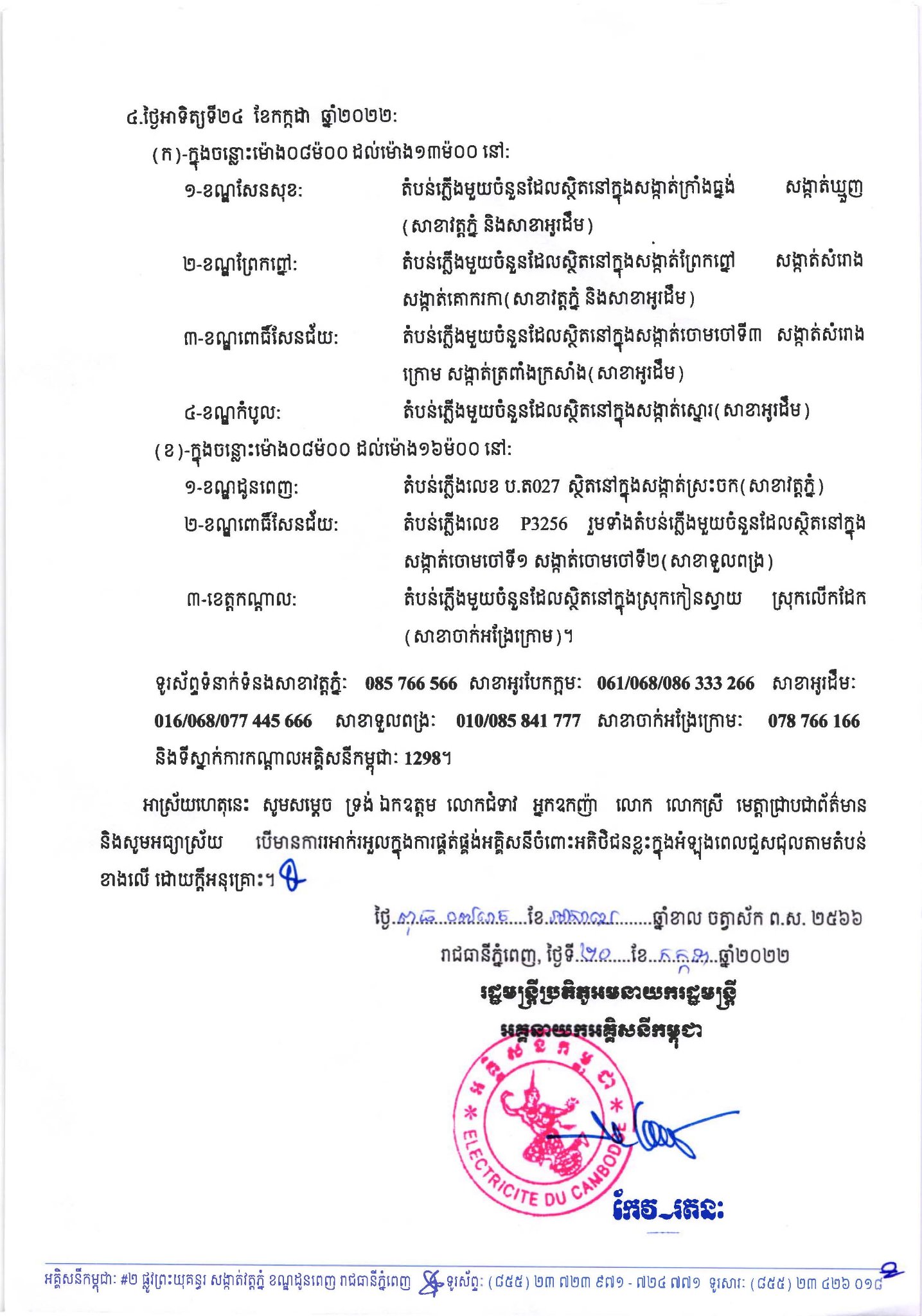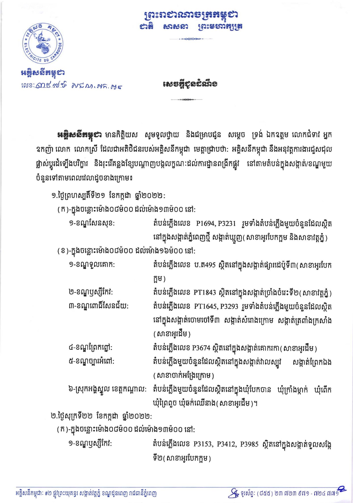 សូមអានសេចក្តីជូនដំណឹង របស់អគ្គិសនីកម្ពុជា ដូចខាងក្រោម៖