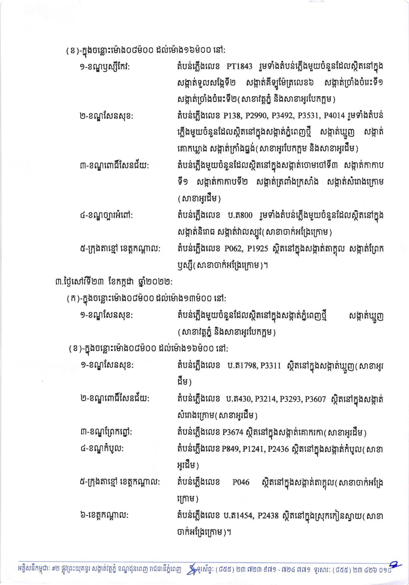 អគ្គិសនីកម្ពុជា ជូនដំណឹងពីការរអាក់រអួលចរន្ត ចាប់ពីថ្ងៃនេះដល់ថ្ងៃទី២៤ ខែកក្កដា ដើម្បីរុះរើគន្លង ខ្សែបណ្តាញ ផ្លាស់ប្តូរ តម្លើងបរិក្ខារ ងាយស្រួលដល់ការដ្ឋានពង្រីកផ្លូវ