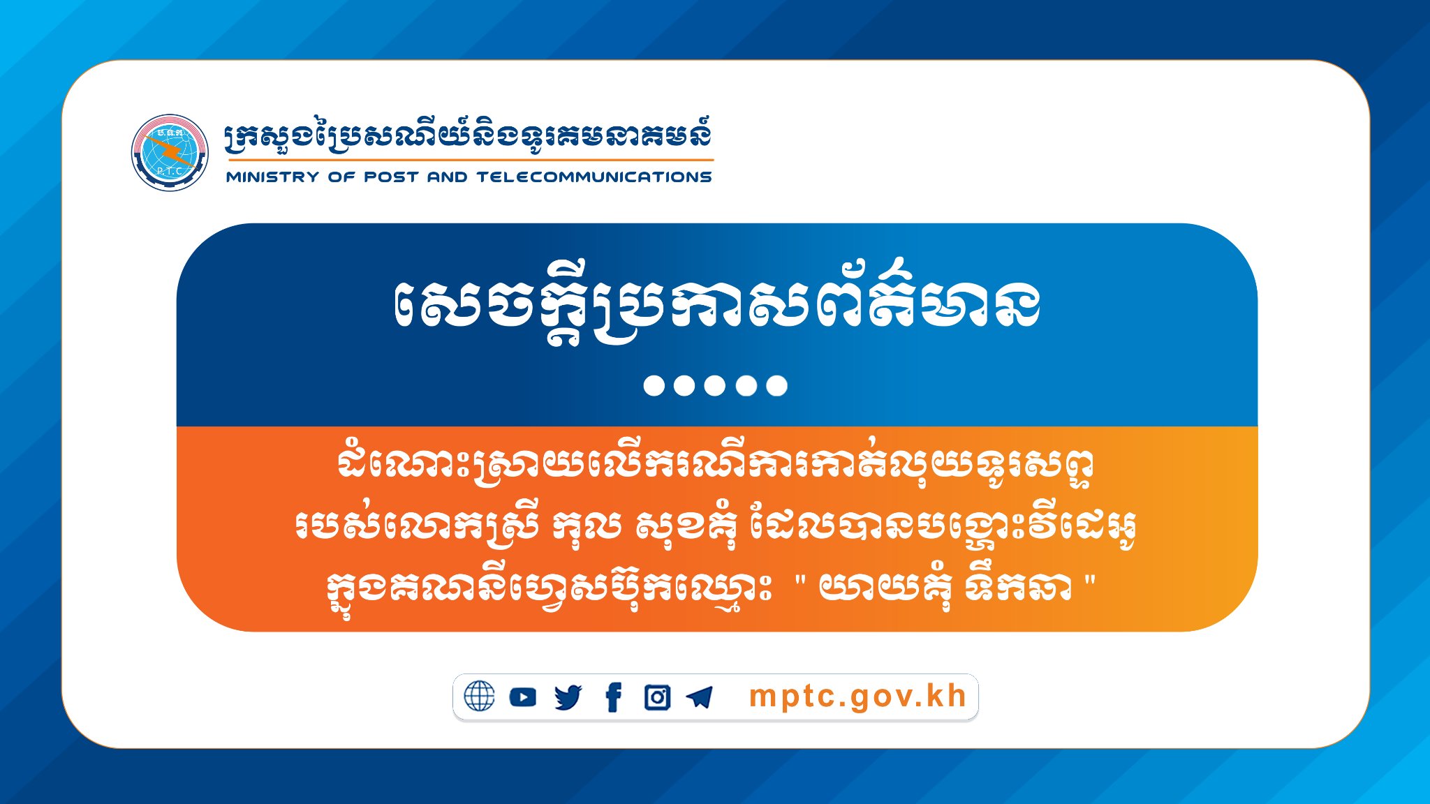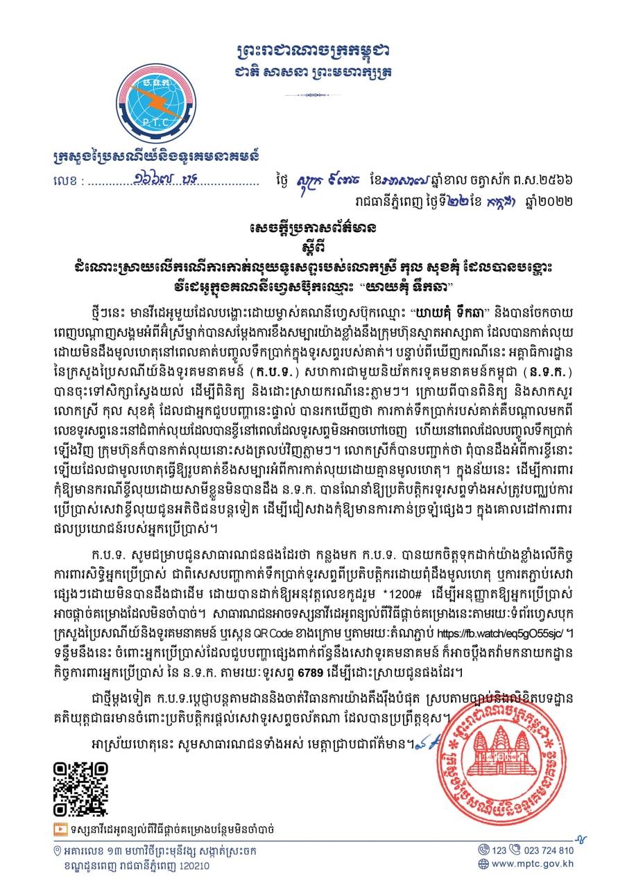 (ភ្នំពេញ)៖ ក្រសួងប្រៃសណីយ៍ និងទូរគមនាគមន៍ នៅថ្ងៃទី២២ ខែកក្កដា ឆ្នាំ២០២២នេះ បានចេញសេចក្តីប្រកាសព័ត៌មាន ស្តីពី ដំណោះស្រាយលើករណី ការកាត់លុយទូរសព្ទរបស់លោកស្រី កុល សុខគុំ ដែលបានបង្ហោះវីដេអូ ក្នុងគណនីហ្វេសប៊ុកឈ្មោះ «យាយគុំ ទឹកឆា»។ នេះបើតាមសេចក្ដីប្រកាសព័ត៌មាន ដែលបណ្ដាញព័ត៌មាន Fresh News ទទួលបាន។
