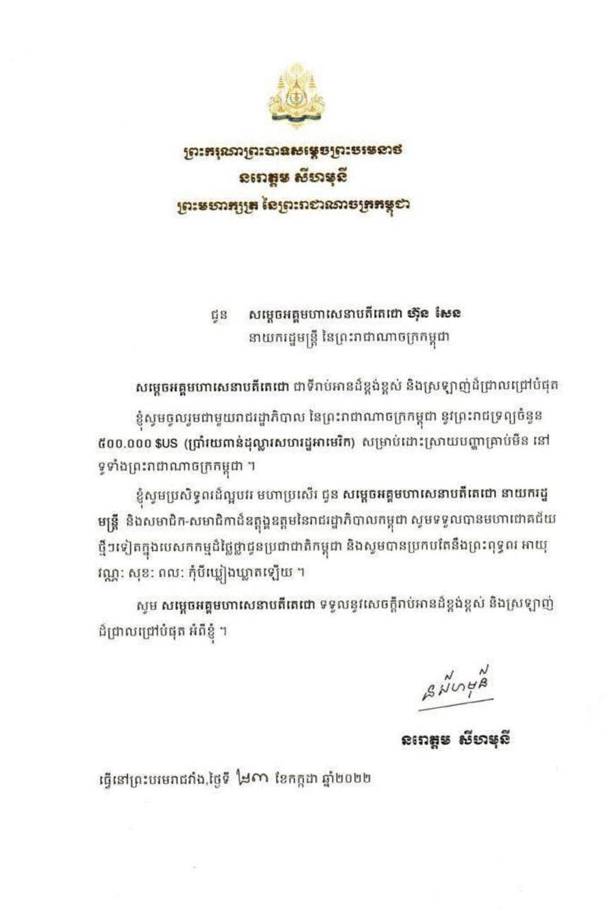 (ភ្នំពេញ)៖ ព្រះករុណា ព្រះបាទ សម្តេចព្រះបរមនាថ នរោត្តម សីហមុនី ព្រះមហាក្សត្រនៃកម្ពុជា បានប្រោសព្រះរាជទាន នូវព្រះរាជទ្រព្យចំនួន ៥០ម៉ឺនដុល្លារអាមេរិក ចូលរួមជាមួយរាជរដ្ឋាភិបាល សម្រាប់ដោះស្រាយបញ្ហាគ្រាប់មីន នៅទូទាំងប្រទេសកម្ពុជា។ នេះបើតាមព្រះរាជសារលិខិតរបស់ព្រះមហាក្សត្រ ផ្ញើជូនសម្តេចតេជោ ហ៊ុន សែន នាយករដ្ឋមន្ត្រីនៃកម្ពុជា ដែលបណ្តាញព័ត៌មាន Fresh News ទទួលបាននៅថ្ងៃទី២៥ ខែកក្កដា ឆ្នាំ២០២២នេះ។