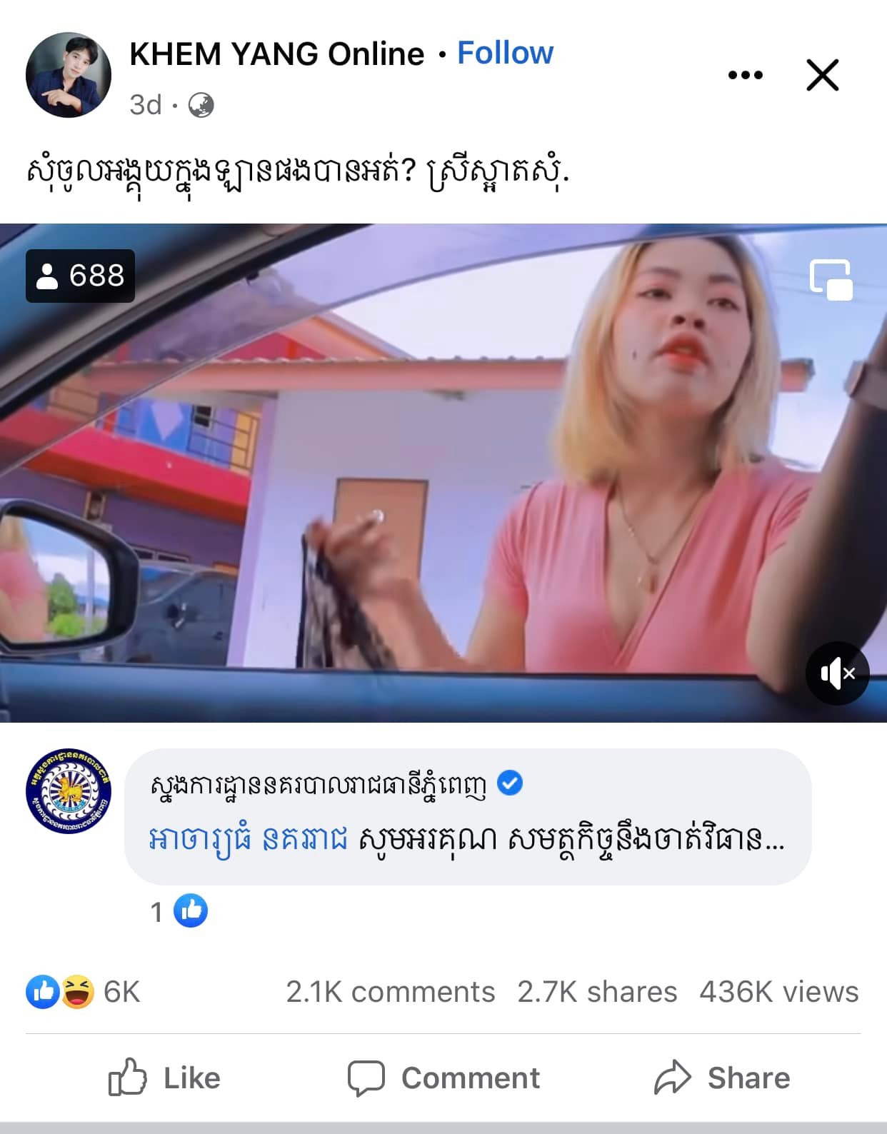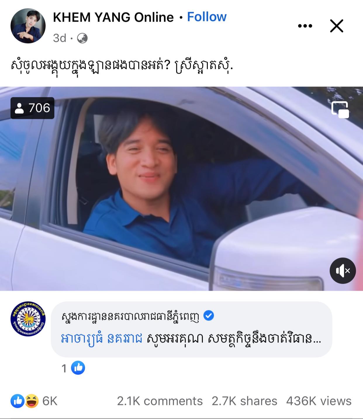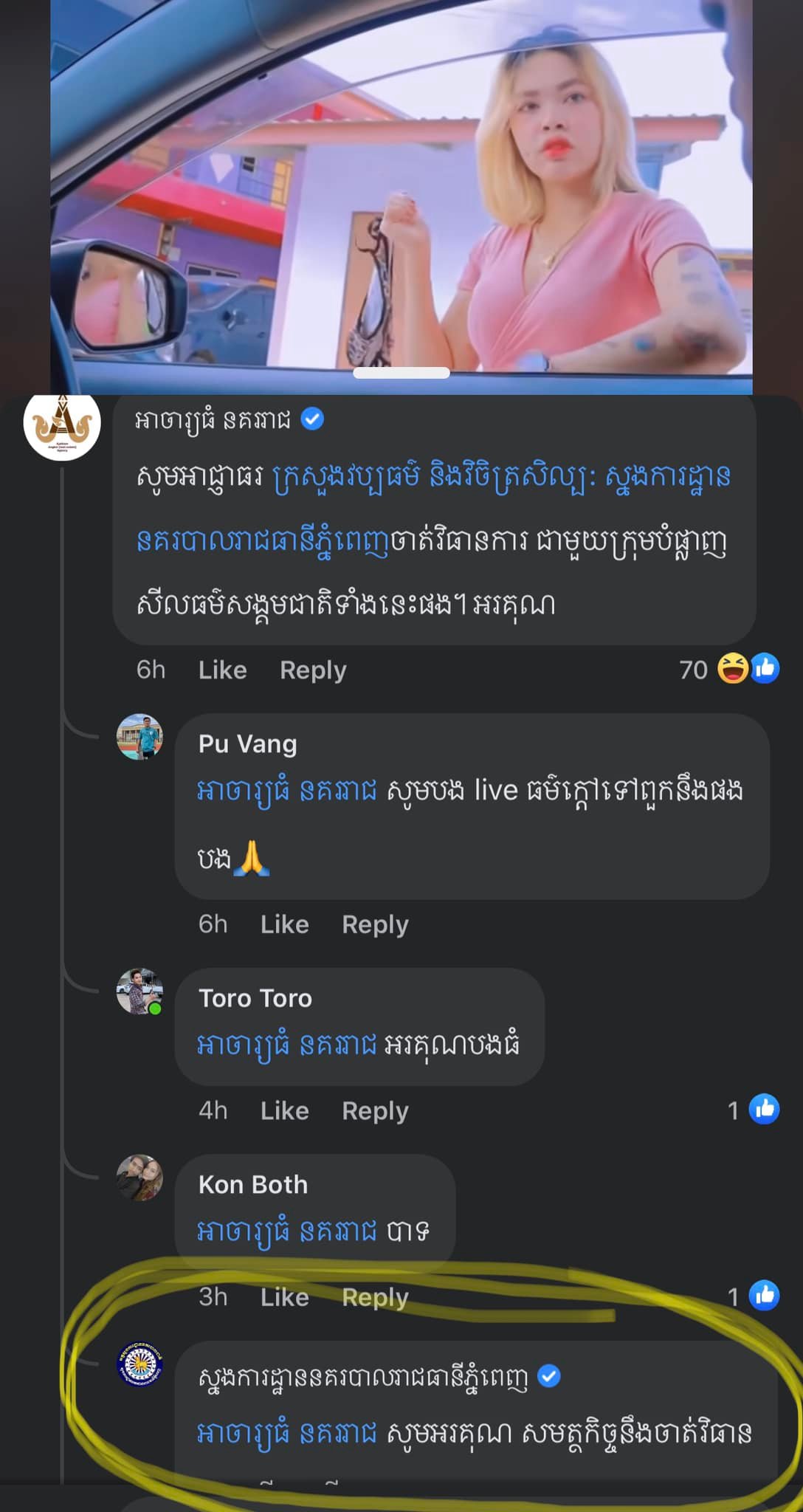 ទាក់ទងនឹងករណីនេះដែរ ស្នងការដ្ឋាននគរបាលរាជធានីភ្នំពេញ បាន comment នៅក្នុងបណ្តាញសង្គមហ្វេសប៊ុកថា «សមត្ថកិច្ចនឹងចាត់វិធានការលើករណីនេះ» ដែលធ្វើឲ្យមហាជនមានការសាទរយ៉ាងខ្លាំង។