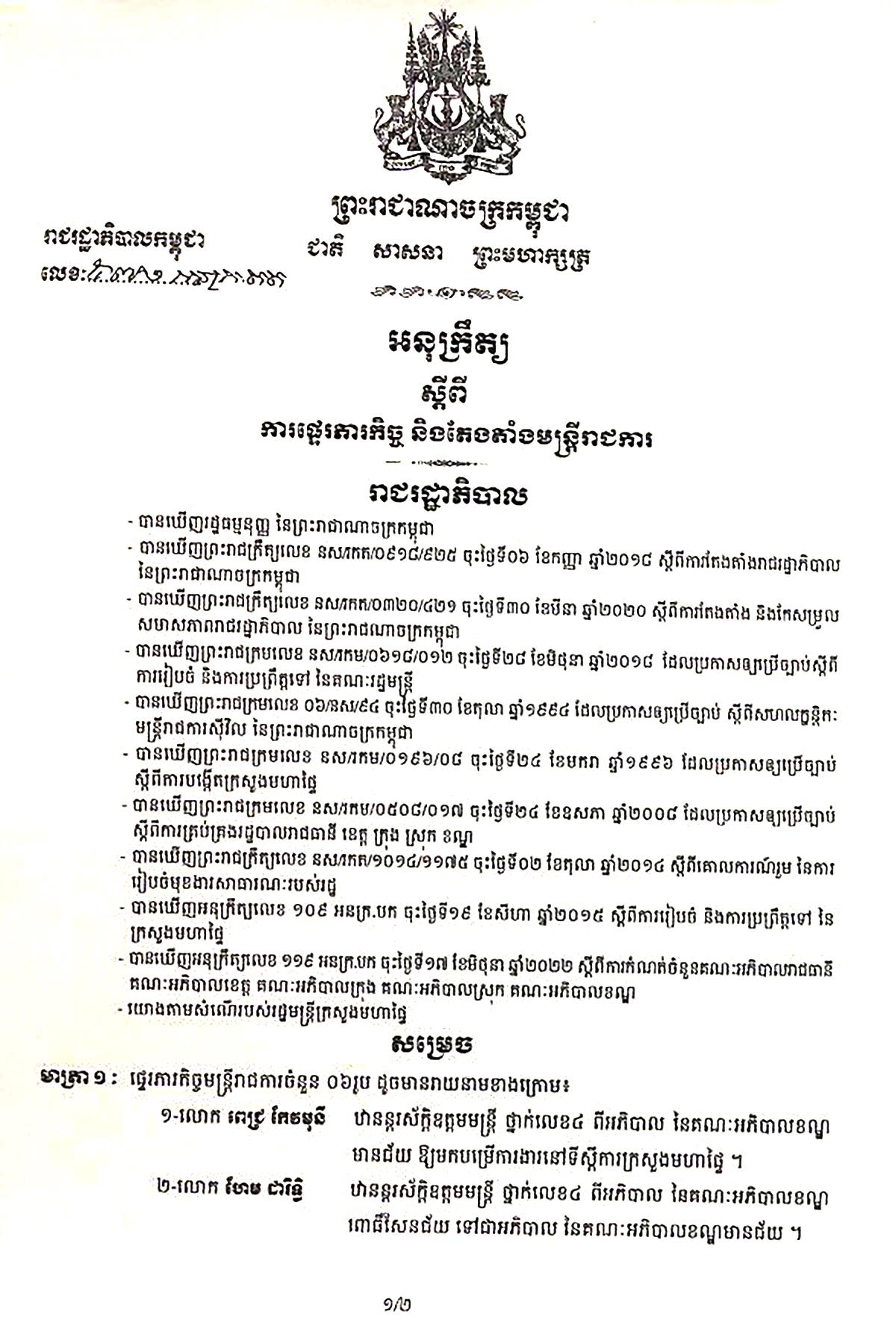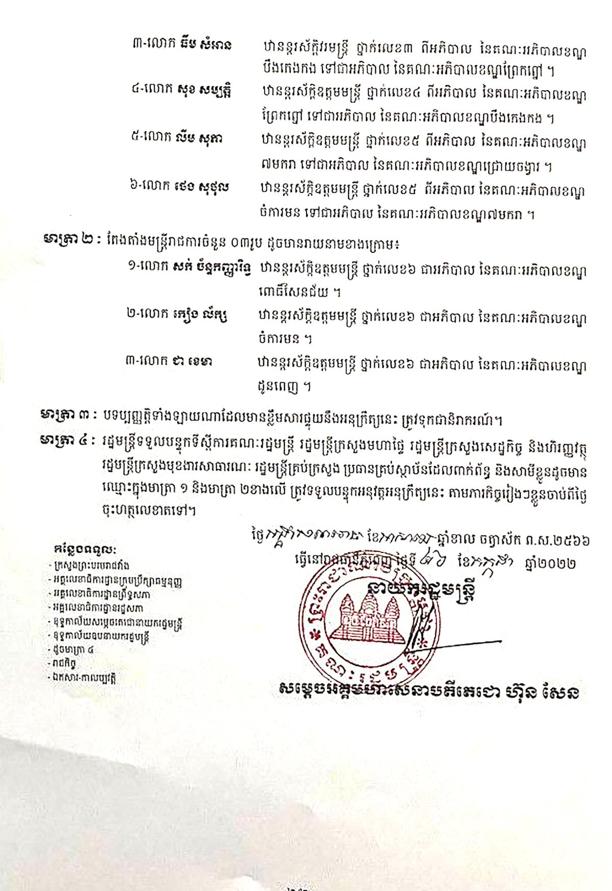 (ភ្នំពេញ)៖ សម្តេចតេជោ ហ៊ុន សែន នាយករដ្ឋមន្រ្តីនៃកម្ពុជា នៅថ្ងៃទី២៩ ខែកក្កដា ឆ្នាំ២០២២នេះ បានចេញអនុក្រឹត្យផ្ទេរភារកិច្ច និងតែងតាំងអភិបាលខណ្ឌសរុបចំនួន៩រូប។ នេះបើតាមអនុក្រឹត្យដែលបណ្ដាញព័ត៌មាន Fresh News ទទួលបាន។