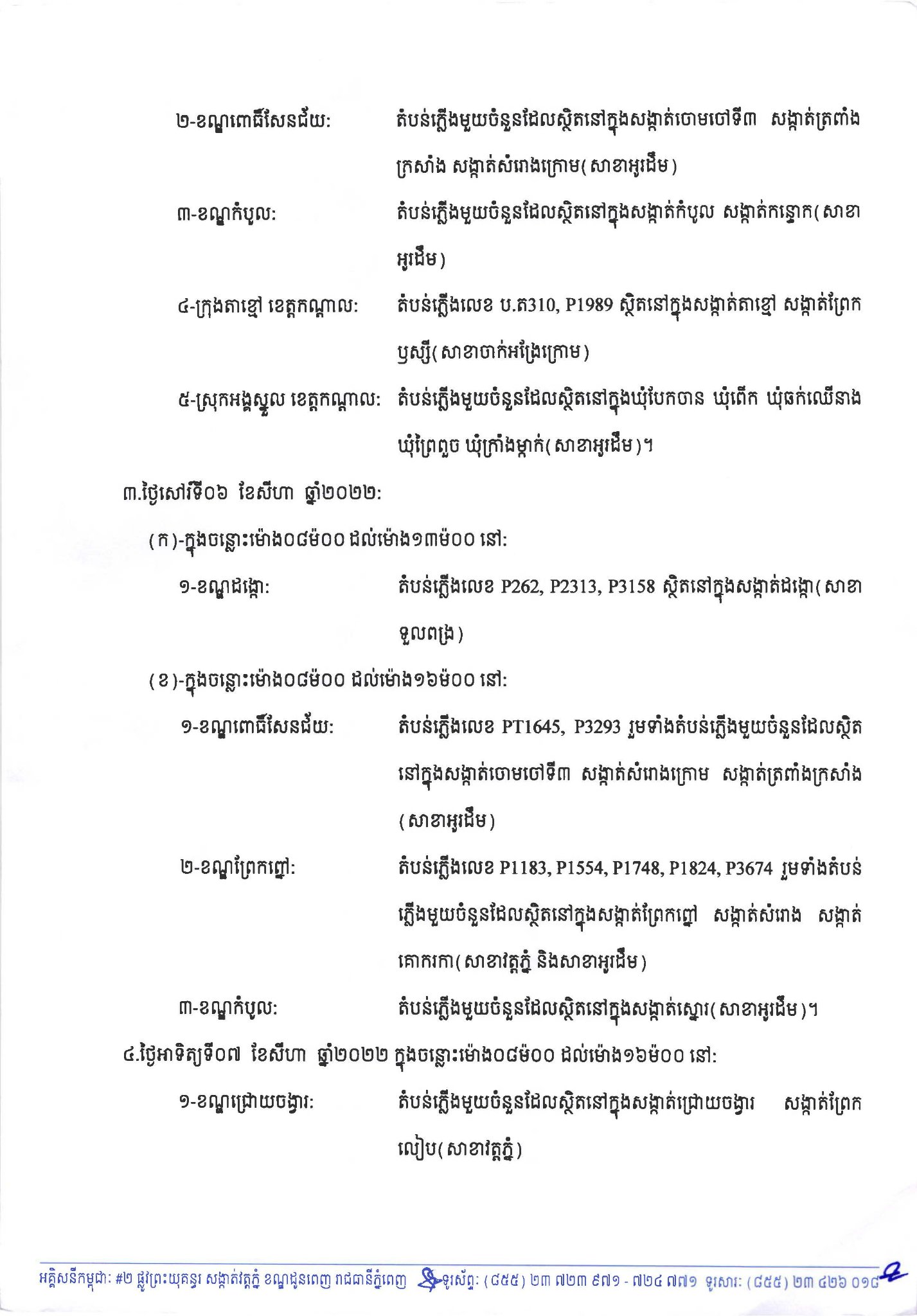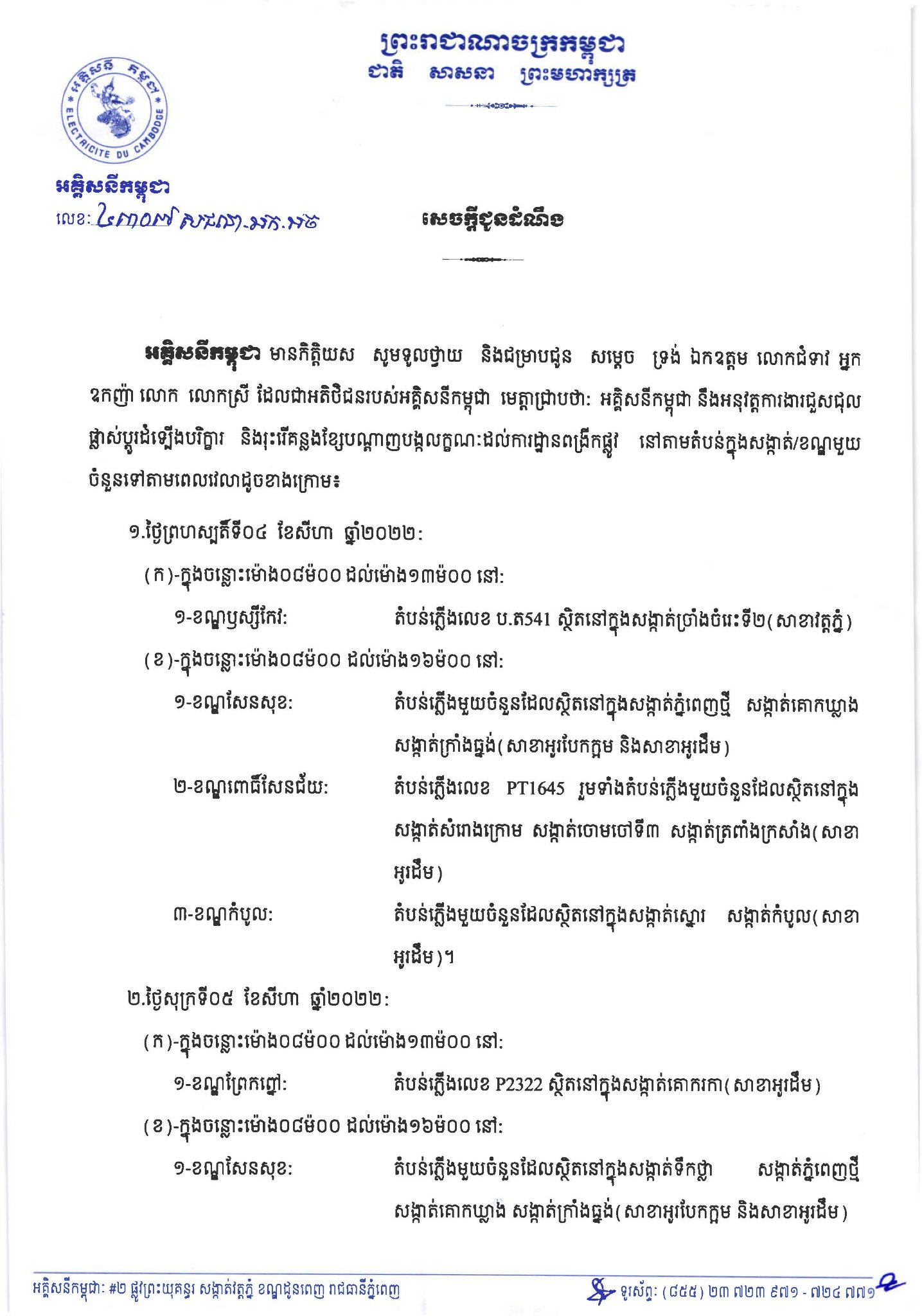 អគ្គិសនីកម្ពុជា ជូនដំណឹងពីការរអាក់រអួលចរន្ត ចាប់ពីថ្ងៃនេះដល់ថ្ងៃទី០៧ ខែសីហា ដើម្បីរុះរើគន្លង ខ្សែបណ្តាញ ផ្លាស់ប្តូរ តម្លើងបរិក្ខារ ងាយស្រួលដល់ការដ្ឋានពង្រីកផ្លូវ