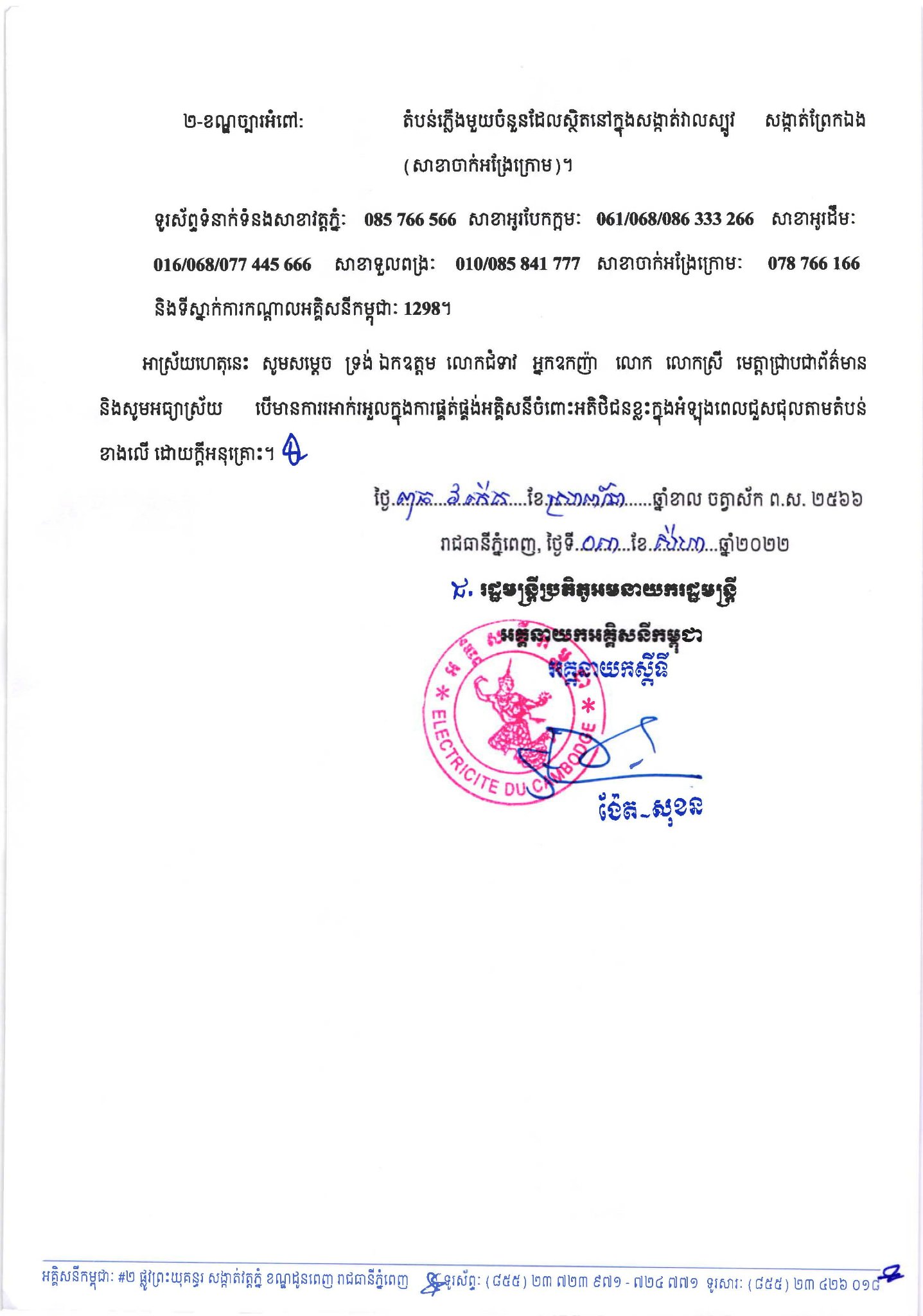 សូមអានសេចក្តីជូនដំណឹង របស់អគ្គិសនីកម្ពុជា ដូចខាងក្រោម៖