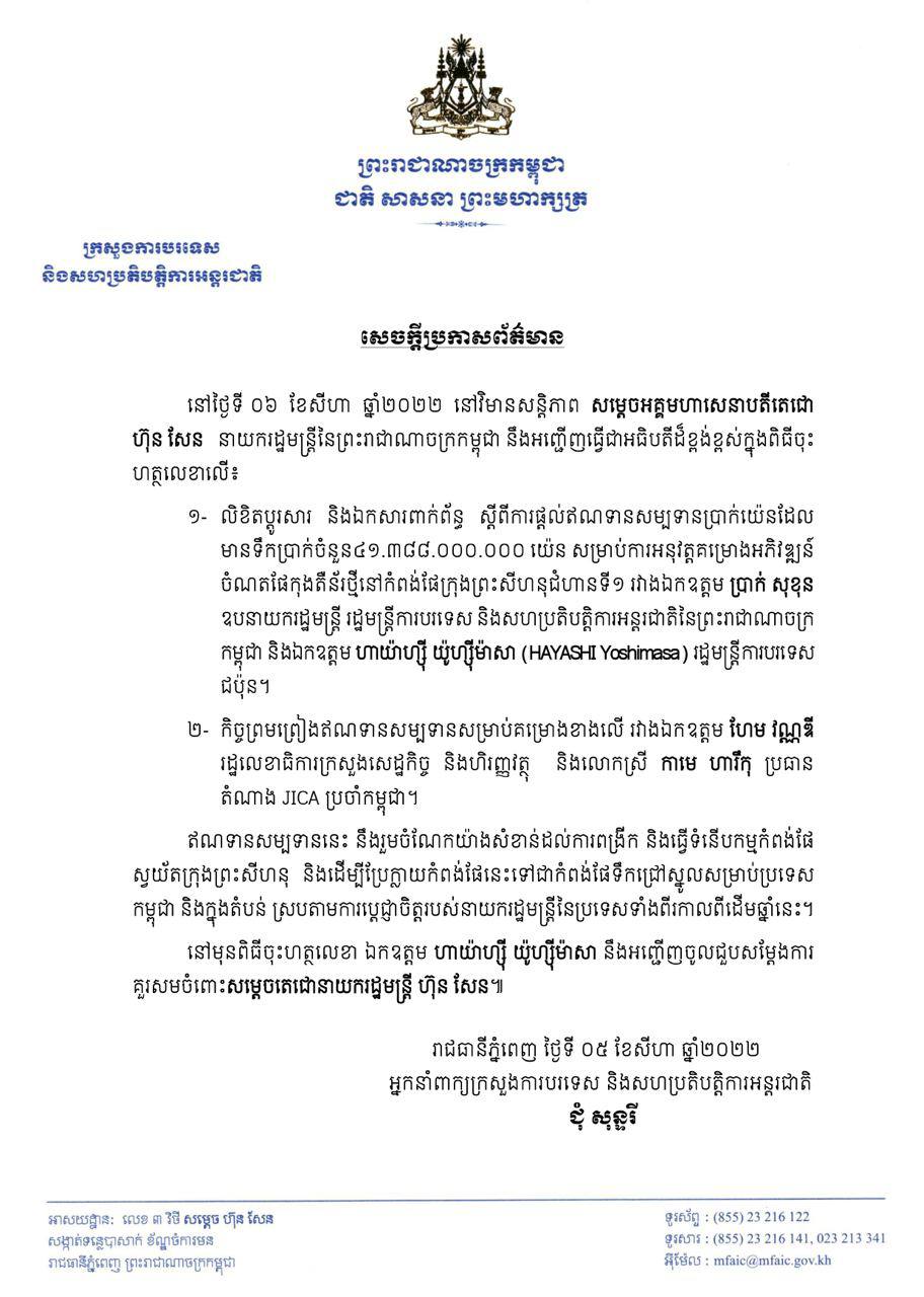 យោងតាមក្រសួងការបរទេសកម្ពុជា បានឱ្យដឹងថា ពិធីចុះហត្ថលេខាលើលិខិតប្តូរសារ និងឯកសារពាក់ព័ន្ធការផ្តល់ឥណទានសម្បទាននេះ នឹងធ្វើឡើងរវាងឧបនាយករដ្ឋមន្ត្រី ប្រាក់ សុខុន រដ្ឋមន្ត្រីក្រសួងការបរទេសកម្ពុជា និងលោក ហាយ៉ាហ្ស៉ី យ៉ូហ្ស៉ីម៉ាសា (HAYASHI Yoshimasa) រដ្ឋមន្ត្រីការបរទេសជប៉ុន។ ពិធីនឹងធ្វើឡើងនៅថ្ងៃទី០៦ ខែសីហា ឆ្នាំ២០២២ នៅវិមានសន្តិភាព ក្រោមអធិបតីភាពសម្តេចតេជោ ហ៊ុន សែន នាយករដ្ឋមន្ត្រីកម្ពុជា។