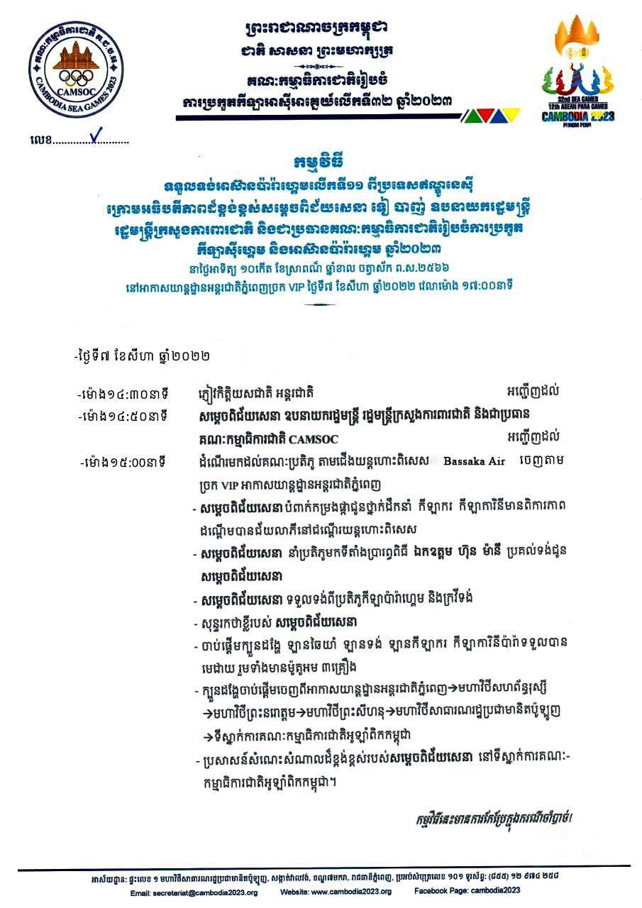 គួរជម្រាបថា សម្រាប់ការចូលរួមប្រកួតកីឡាជនពិការ ASEAN Para Games 2022 លើកទី១១ នៅទីក្រុង Solo ប្រទេសឥណ្ឌូនេស៊ី ជាលទ្ធផលកម្ពុជាដណ្តើមបានមេដាយសរុប ២៨គ្រឿង ដោយក្នុងនោះមេដាយមាស ៧ ប្រាក់ ១០ និងសំរិទ្ធ ១១គ្រឿងផងដែរ។