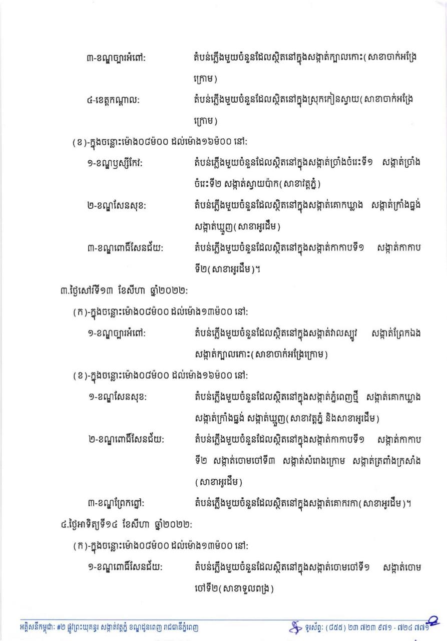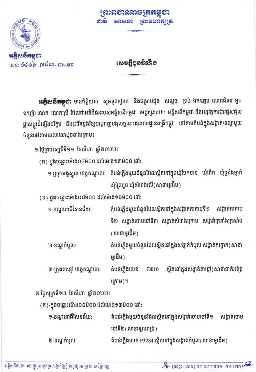 (ភ្នំពេញ)៖ អគ្គិសនីកម្ពុជា (EDC) បានចេញសេចក្តីជូនដំណឹង ស្តីពីការអនុវត្តការងារជួសជុល ផ្លាស់ប្តូរតម្លើងបរិក្ខារនានា និងរុះរើគន្លងខ្សែបណ្តាញ អគ្គិសនី របស់អគ្គិសនីកម្ពុជា ដើម្បីបង្កលក្ខណៈងាយស្រួល ដល់ការដ្ឋានពង្រីកផ្លូវ នៅថ្ងៃទី១១ ខែសីហា ឆ្នាំ២០២២ ដល់ថ្ងៃទី១៤ ខែសីហា ឆ្នាំ២០២២ នៅតំបន់មួយចំនួនទៅតាមពេលវេលា និងទីកន្លែងដូចសេចក្តីជូនដំណឹងលម្អិតខាងក្រោម។