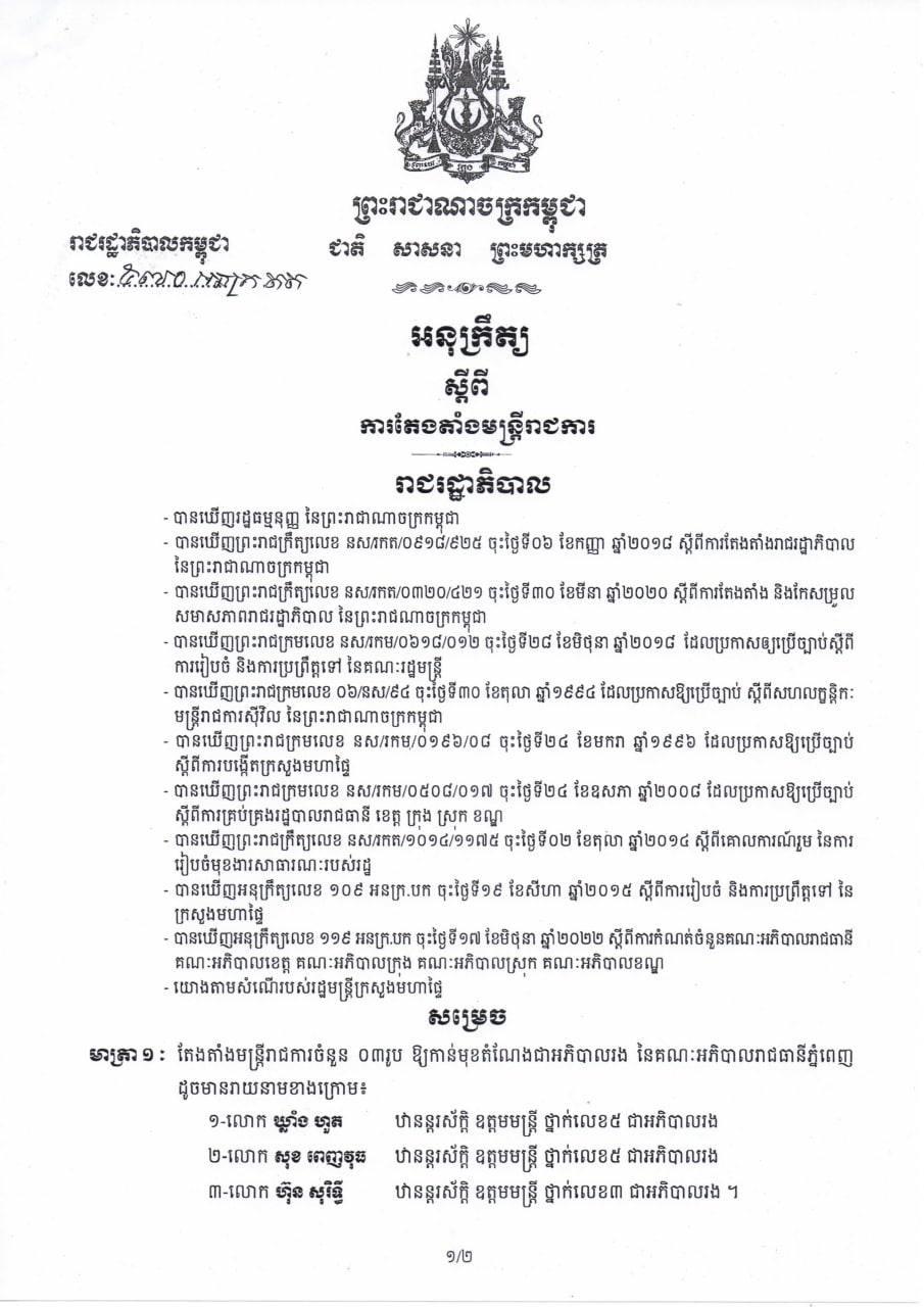(ភ្នំពេញ)៖ អភិបាលរងរាជធានីភ្នំពេញ ចំនួន៣រូប ដែលត្រូវសម្ដេចតេជោ ហ៊ុន សែន នាយករដ្ឋមន្ដ្រីនៃកម្ពុជា ចេញអនុក្រឹត្យតែងតាំងនោះ នឹងត្រូវប្រកាសចូលកាន់តំណែងជាផ្លូវការ នៅរសៀលថ្ងៃទី១៧ ខែសីហា ឆ្នាំ២០២២ស្អែកនេះ ក្រោមអធិបតីភាព លោក សក់ សេដ្ឋា រដ្ឋលេខាធិការប្រចាំការក្រសួងមហាផ្ទៃ ព្រមទាំងមានការអញ្ជើញចូលរួមពីលោក ម៉ប់ សារិន ប្រធានក្រុមប្រឹក្សារាជធានីភ្នំពេញ និងលោក ឃួង ស្រេង អភិបាលរាជធានី។