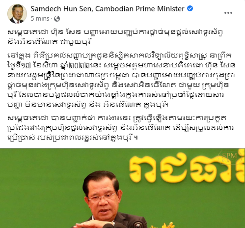 សម្ដេចតេជោ ហ៊ុន សែន បញ្ជាអោយបញ្ឈប់ការផ្ដាច់មុខផ្ដល់សេវាទូរស័ព្ទ និងអ៉ិនធើណែត ជាមួយបុរី