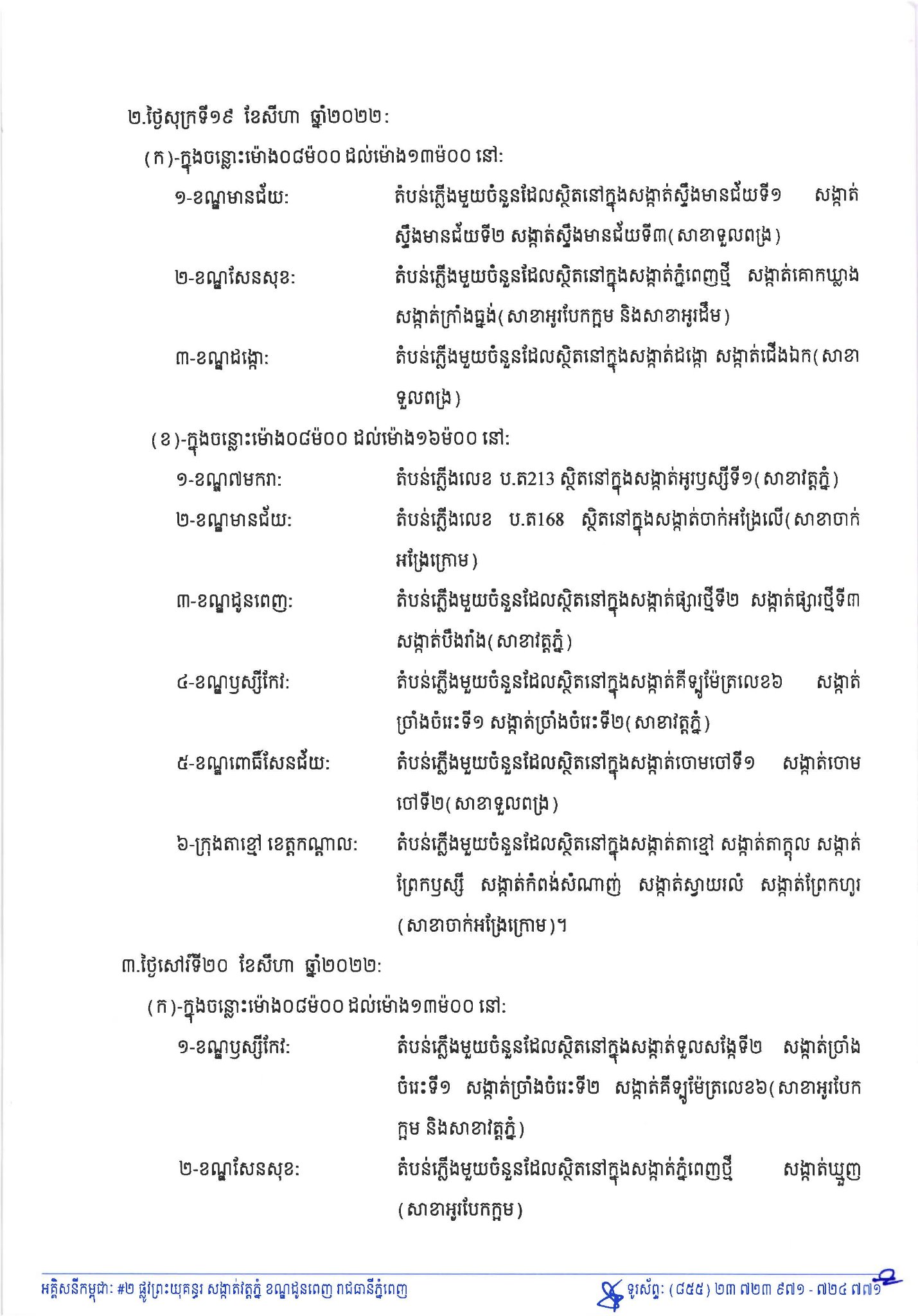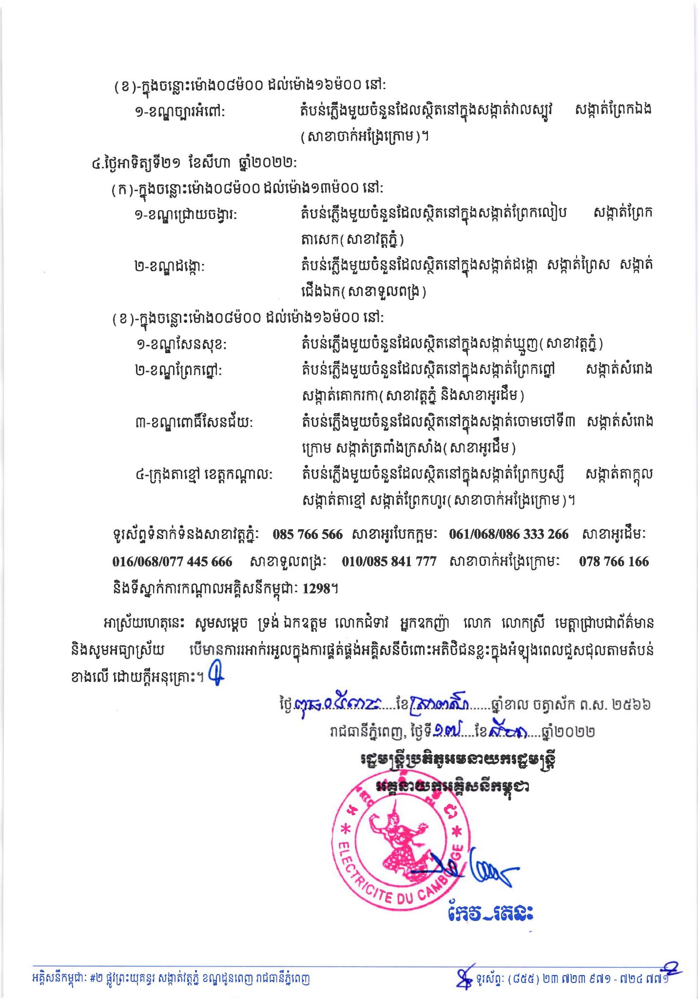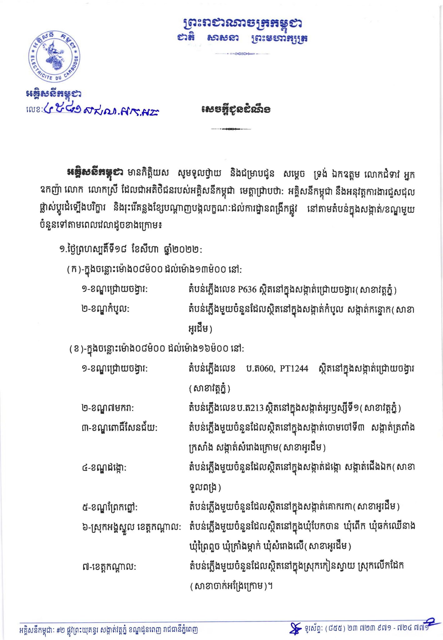 អគ្គិសនីកម្ពុជា ជូនដំណឹងពីការរអាក់រអួលចរន្ត ចាប់ពីថ្ងៃនេះដល់ថ្ងៃទី២១ ខែសីហា ដើម្បីរុះរើគន្លង ខ្សែបណ្តាញ ផ្លាស់ប្តូរ តម្លើងបរិក្ខារ ងាយស្រួលដល់ការដ្ឋានពង្រីកផ្លូវ