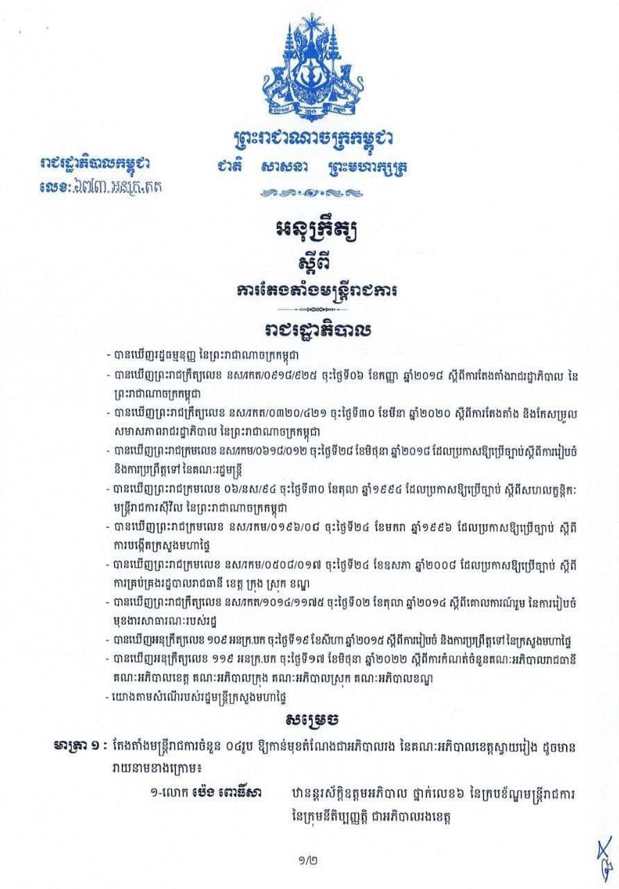 (ភ្នំពេញ)៖ សម្ដេចតេជោ ហ៊ុន សែន នាយករដ្ឋមន្ដ្រីនៃកម្ពុជា បានចេញអនុក្រឹត្យ តែងតាំងមន្ដ្រីរាជការចំនួន៤រូប ជាអភិបាលរង ខេត្តស្វាយរៀង។ នេះបើតាមអនុក្រឹត្យ ដែលបណ្ដាញព័ត៌មាន Fresh News ទទួលបាននៅថ្ងៃទី១៩ ខែសីហា ឆ្នាំ២០២២។