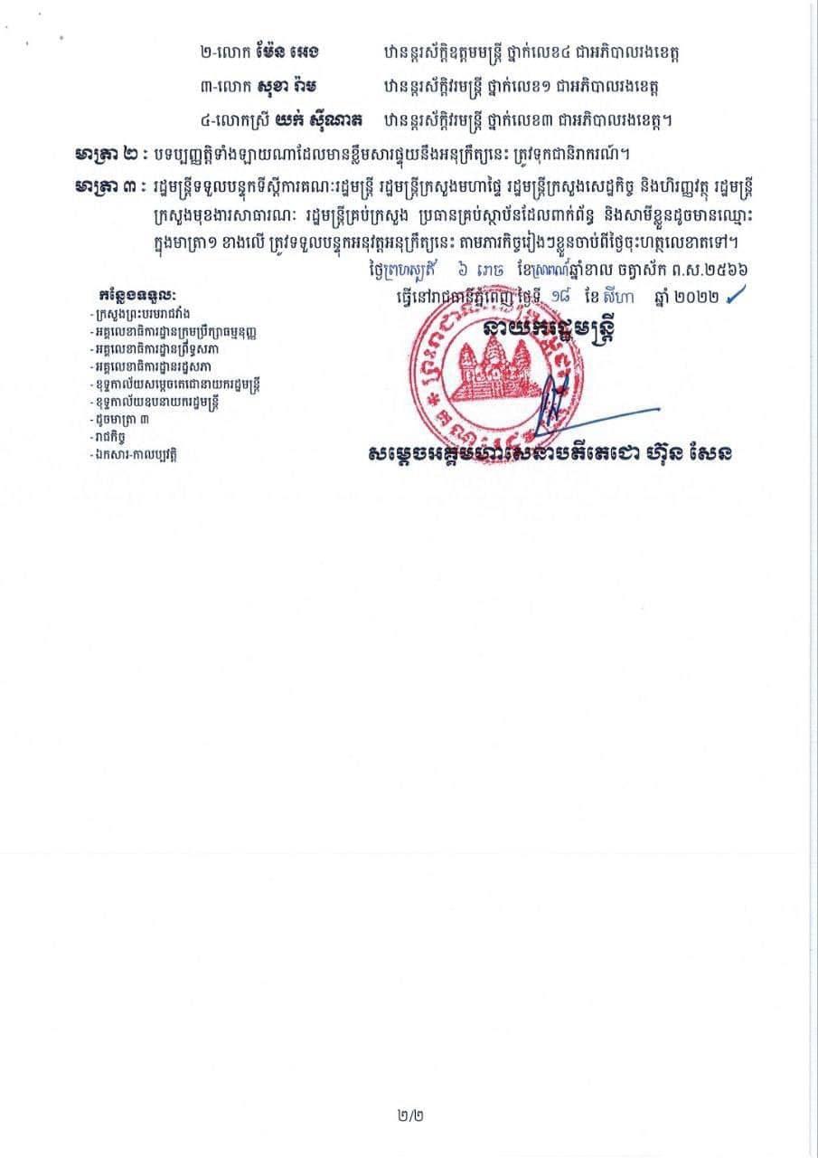 ខាងក្រោមនេះ ជាអនុក្រឹត្យ របស់សម្ដេចតេជោ ហ៊ុន សែន៖