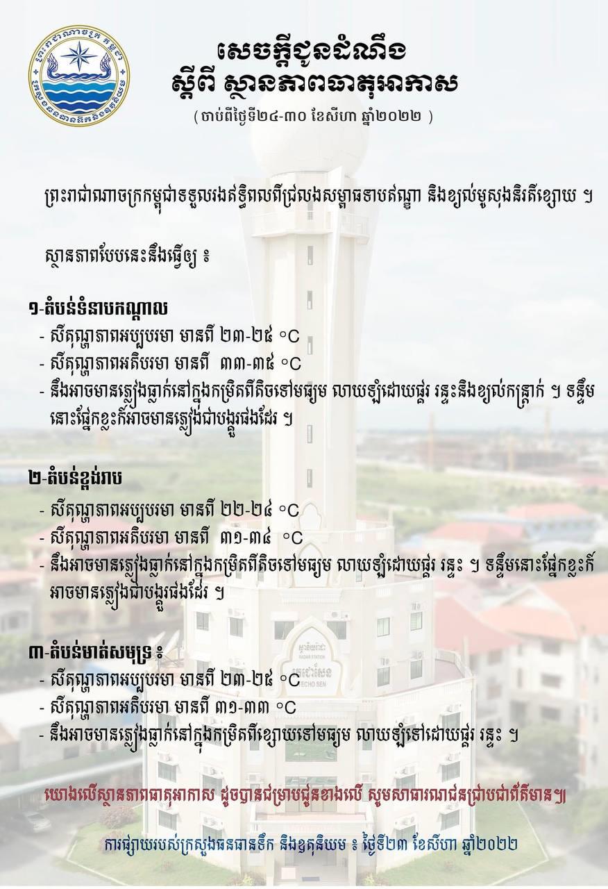 (ភ្នំពេញ)៖ ក្រសួងធនធានទឹក និងឧតុនិយម បានចេញសេចក្តីជូនដំណឹងពីស្ថានភាពអាកាសធាតុ នៅកម្ពុជា ចាប់ពីថ្ងៃនេះដល់ថ្ងៃទី៣០ ខែសីហា ឆ្នាំ២០២២។