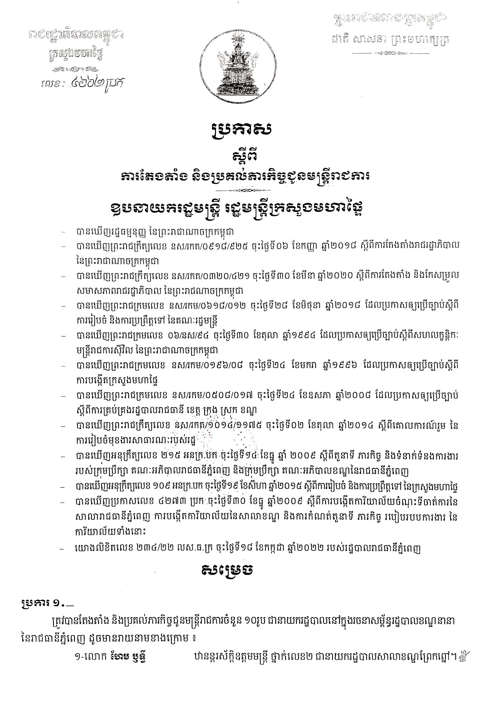 សម្តេចក្រឡាហោម ស ខេង ចេញប្រកាសតែងតាំង និងប្រគល់ភារកិច្ចជានាយករដ្ឋបាលចំនួន១០រូប ក្នុងរចនាសម្ព័ន្ធរដ្ឋបាលខណ្ឌនានានៃរាជធានីភ្នំពេញ