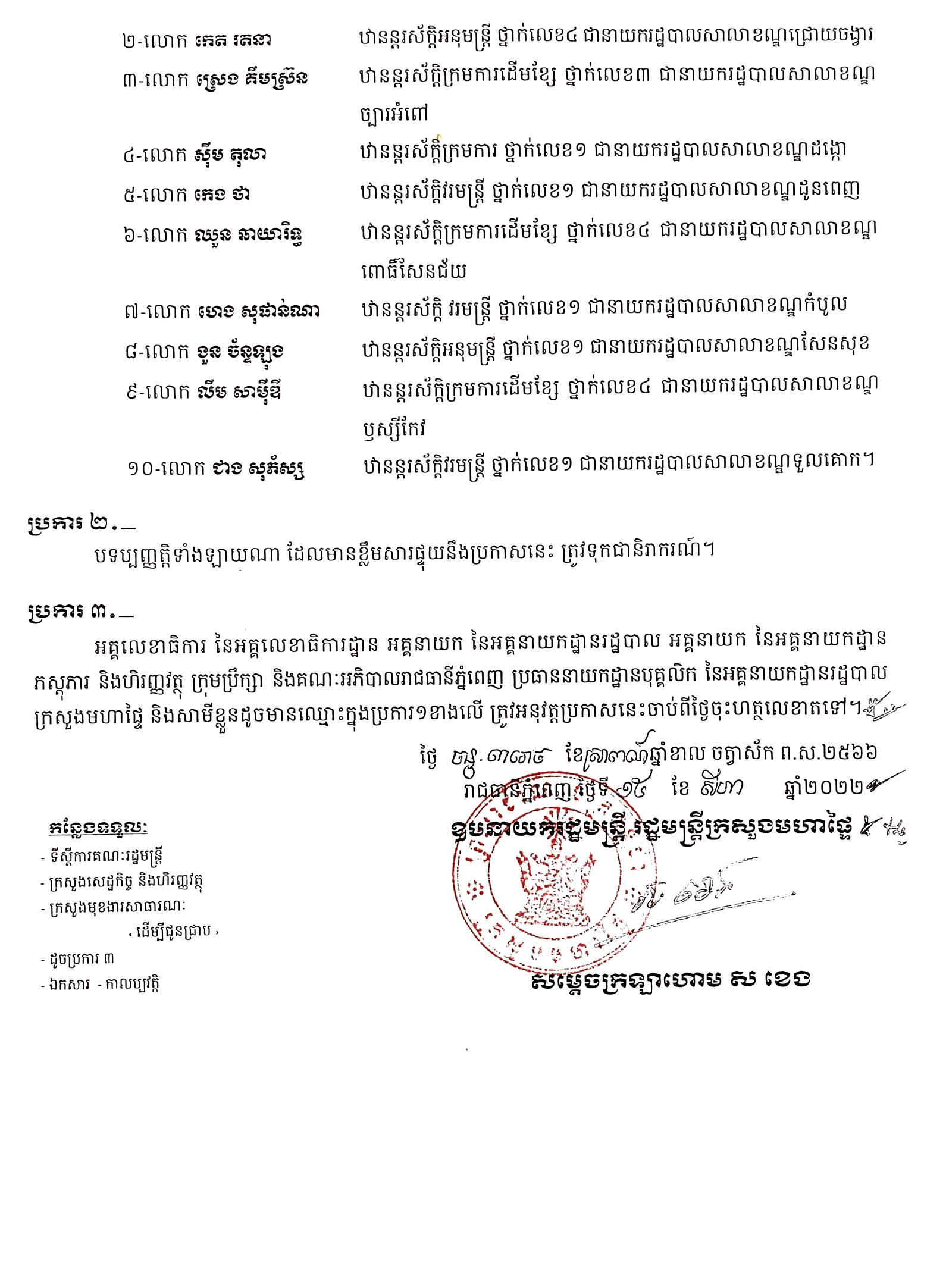 (ភ្នំពេញ)៖ សម្តេចក្រឡាហោម ស ខេង ឧបនាយករដ្ឋមន្ត្រី រដ្ឋមន្ត្រីក្រសួងមហាផ្ទៃ បានចេញប្រកាសតែងតាំង និងប្រគល់ភារកិច្ចជានាយករដ្ឋបាលចំនួន១០រូប ក្នុងរចនាសម្ព័ន្ធរដ្ឋបាលខណ្ឌនានានៃរាជធានីភ្នំពេញ។ នេះបើតាមប្រកាសដែលបណ្តាញព័ត៌មាន Fresh News ទទួលបាននៅព្រឹកថ្ងៃទី២៥ ខែសីហានេះ។