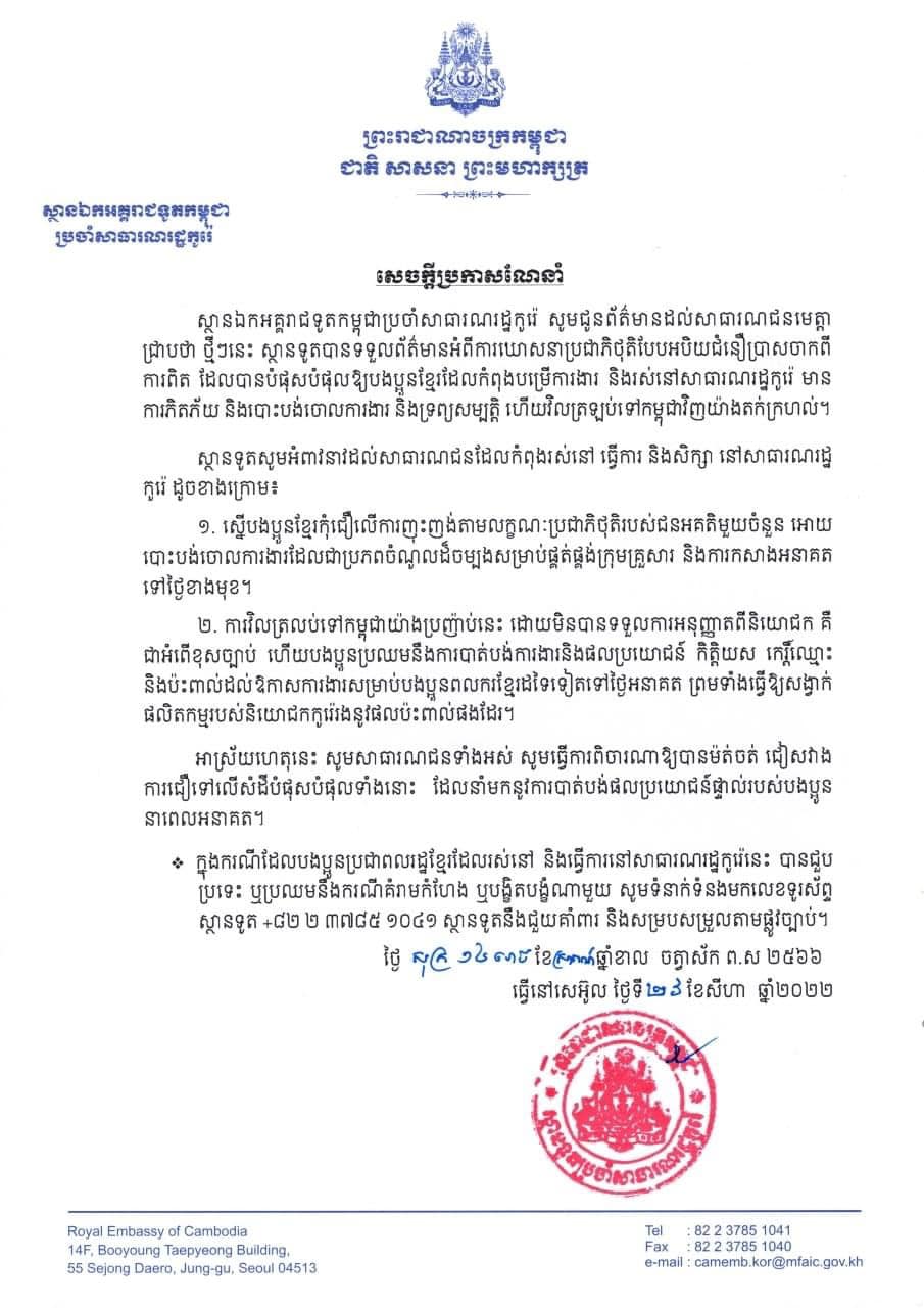 ស្ថានឯកអគ្គរាជទូតកម្ពុជា ប្រចាំសាធារណរដ្ឋកូរ៉េ ចេញសេចក្តីណែនាំ ក្រោយមានការឃោសនាប្រជាភិថុតិបែបអបិយជំនឿប្រាសចាកពីការពិត ដែលបានបំផុសបំផុលឱ្យបងប្អូនខ្មែរដែលកំពុងបម្រើការងារ និងរស់នៅសាធារណរដ្ឋកូរ៉េ មានការភិតភ័យ និងបោះបង់ចោលការងារ និងទ្រព្យសម្បត្តិ