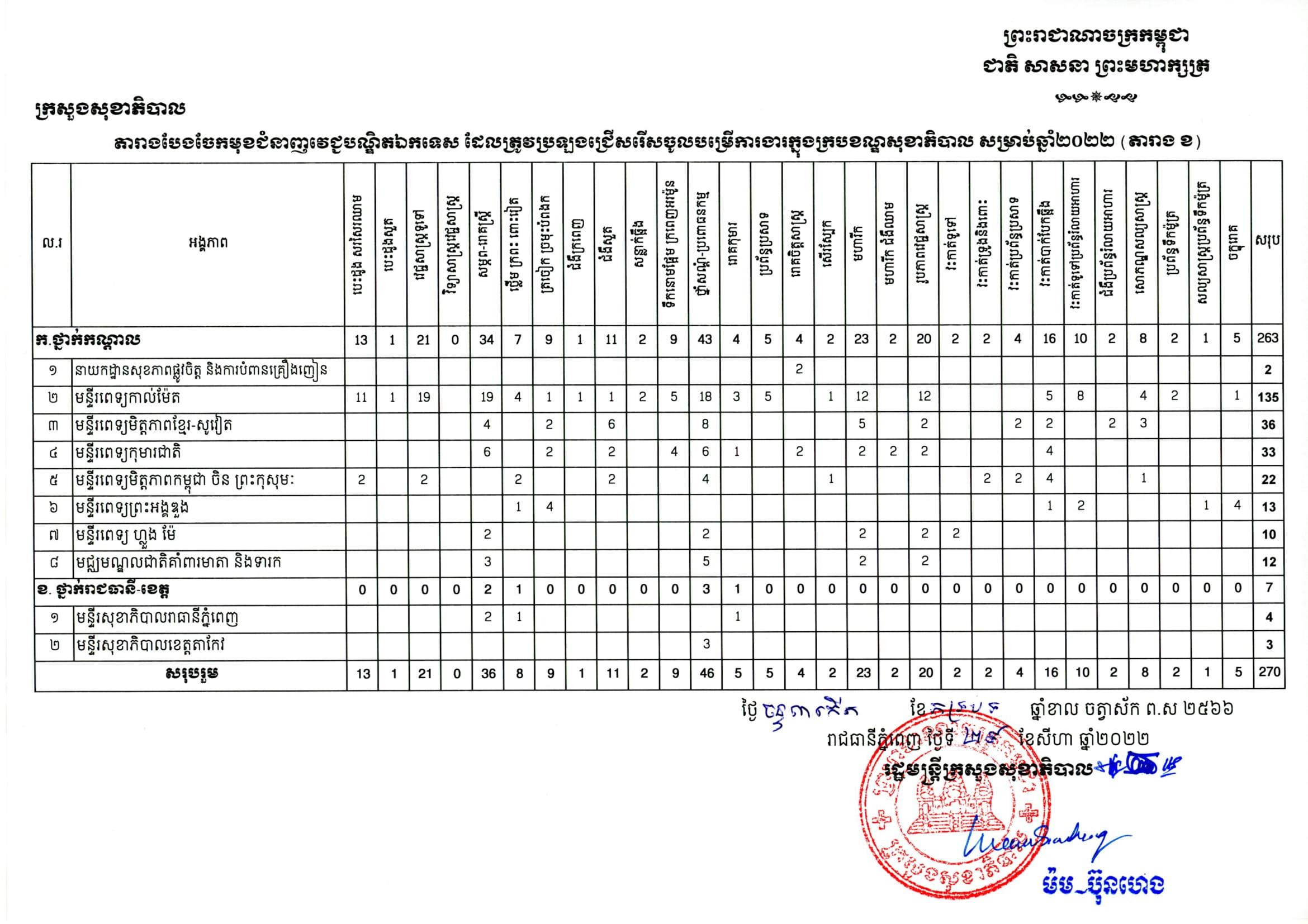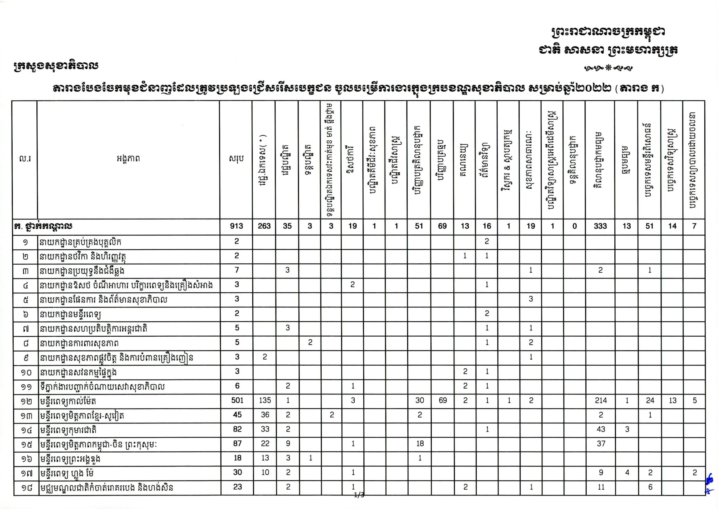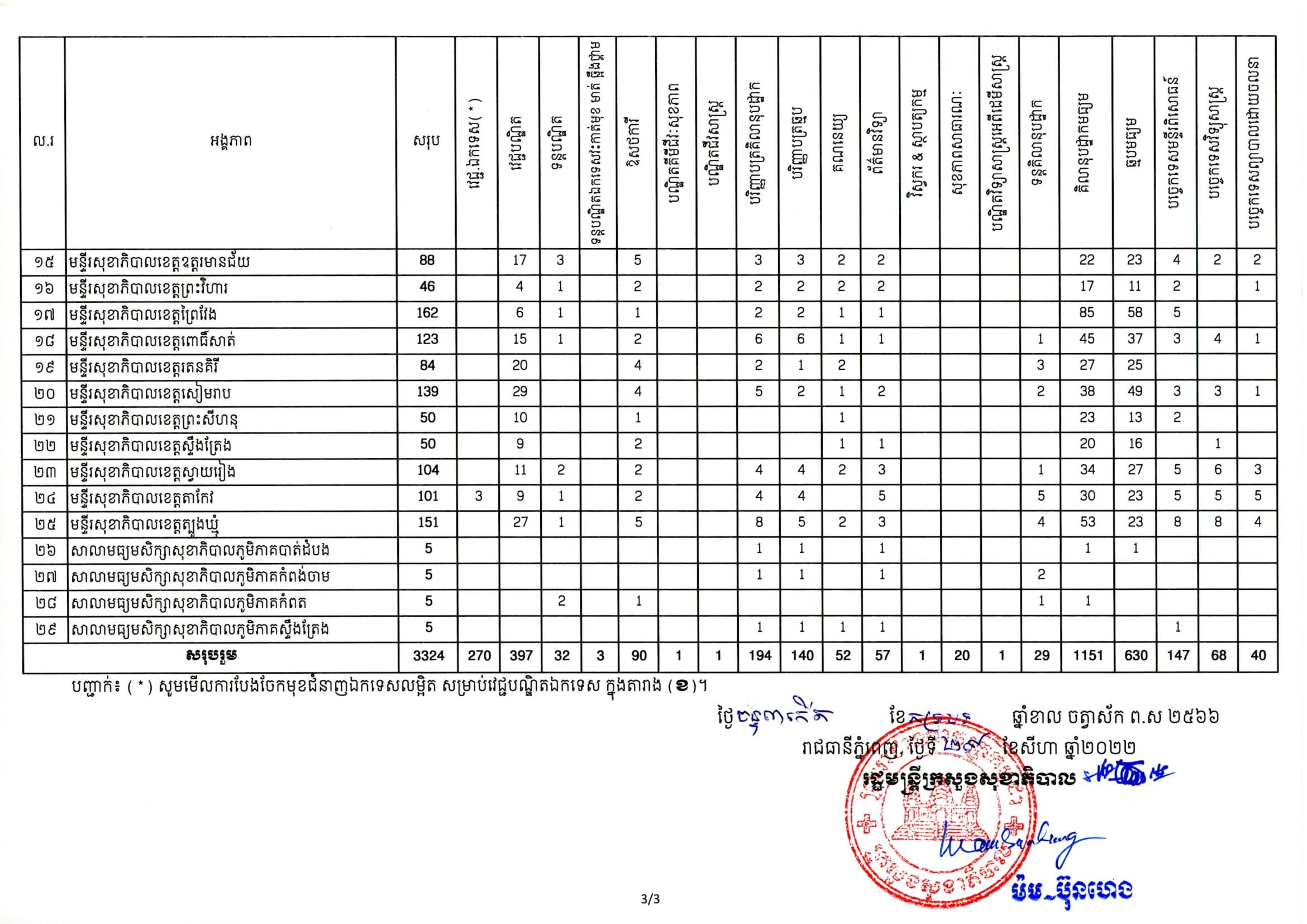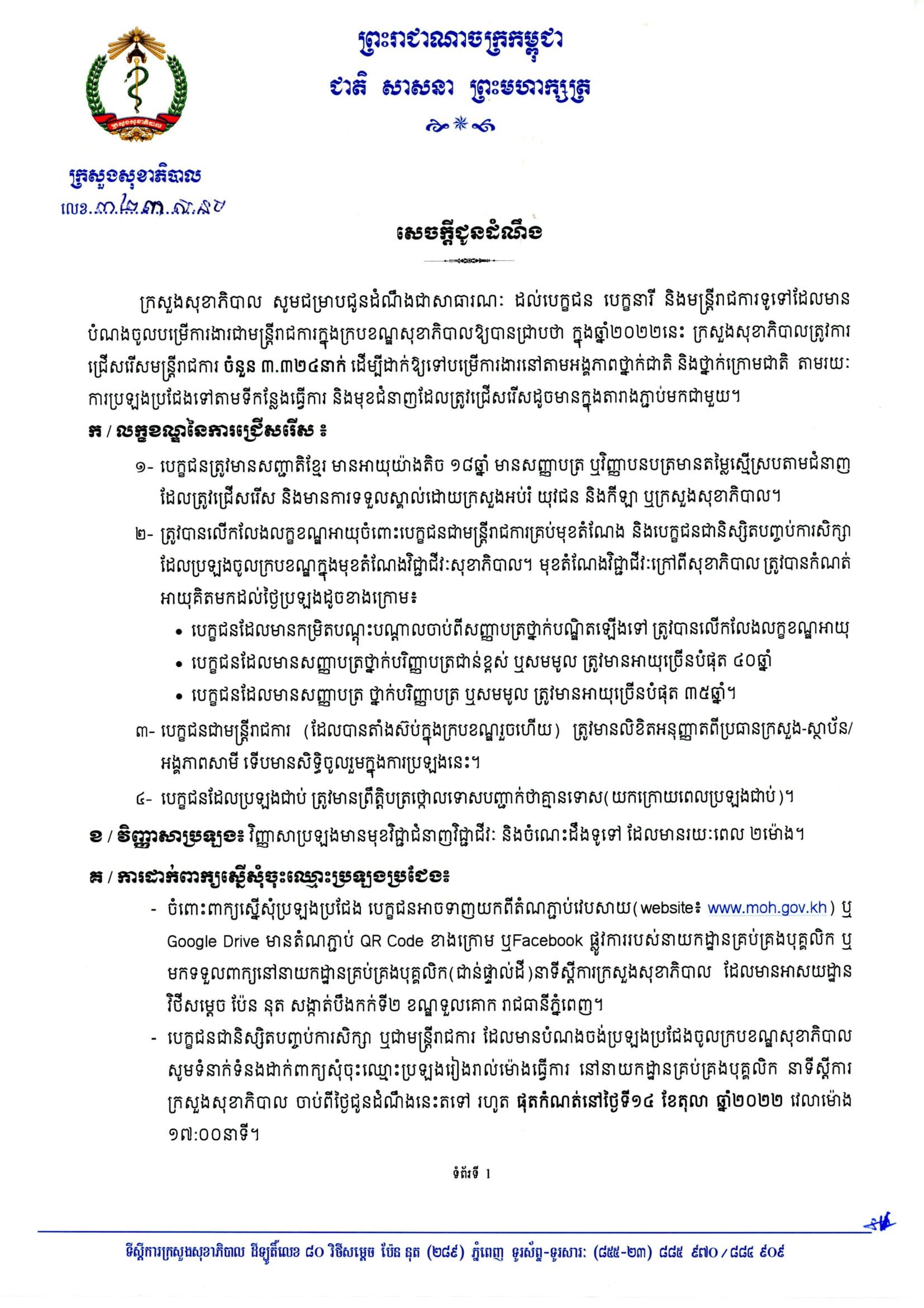 (ភ្នំពេញ)៖ លោក ម៉ម ប៊ុនហេង រដ្ឋមន្ត្រីក្រសួងសុខាភិបាល នៅថ្ងៃទី២៩ ខែសីហា ឆ្នាំ២០២២នេះ បានចេញសេចក្តីជូនដំណឹងប្រកាសពីការ ប្រឡងជ្រើសរើសមន្ត្រីរាជការ ឲ្យចូលបម្រើការងារចំនួន ៣៣២៤នាក់ នៅតាមបណ្តាអង្គភាពថ្នាក់ជាតិ និងថ្នាក់ក្រោមជាតិ។