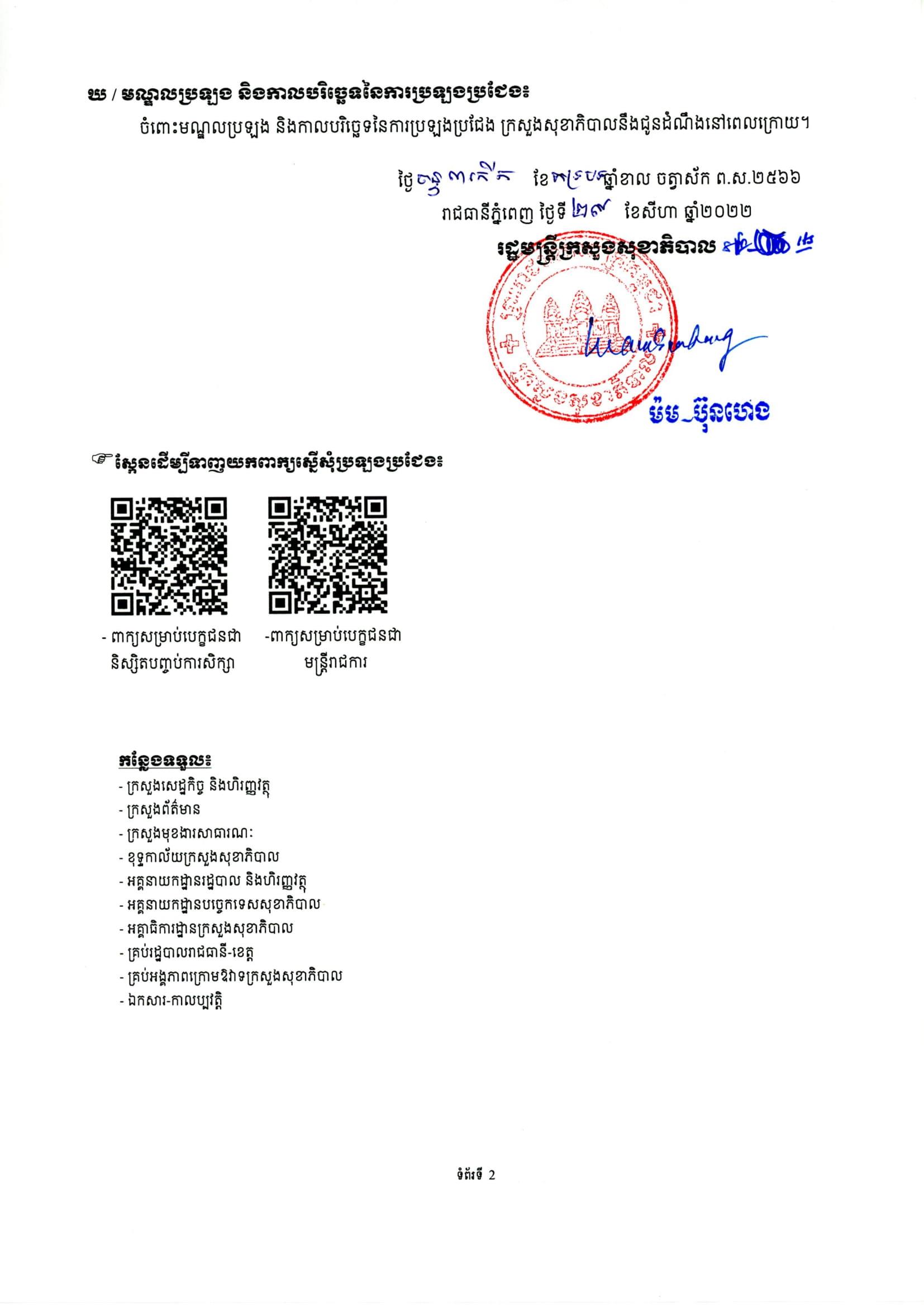 * ចំពោះពាក្យស្នើសុំប្រឡងប្រជែង បេក្ខជនអាចទាញយកពីតំណភ្ជាប់វេបសាយ (website៖ www.moh.gov.kh) ឬ