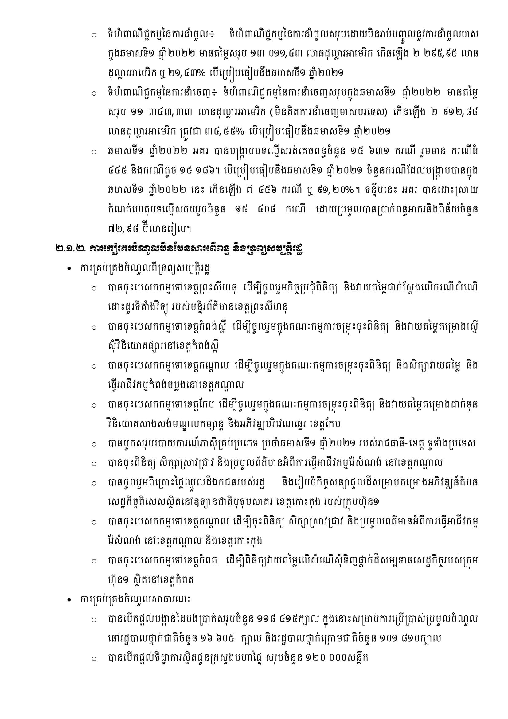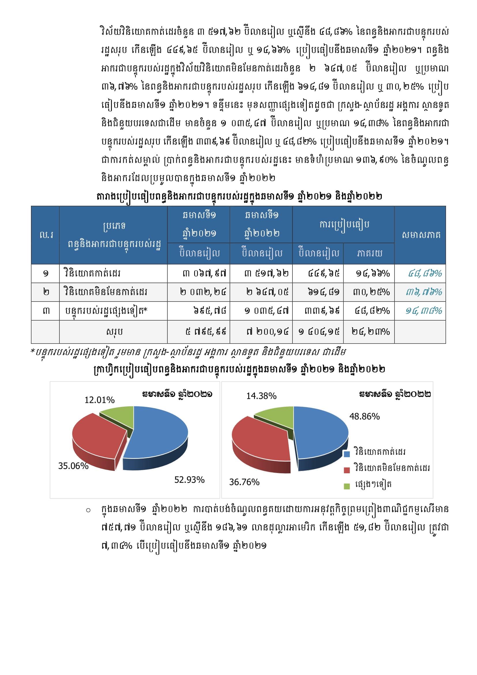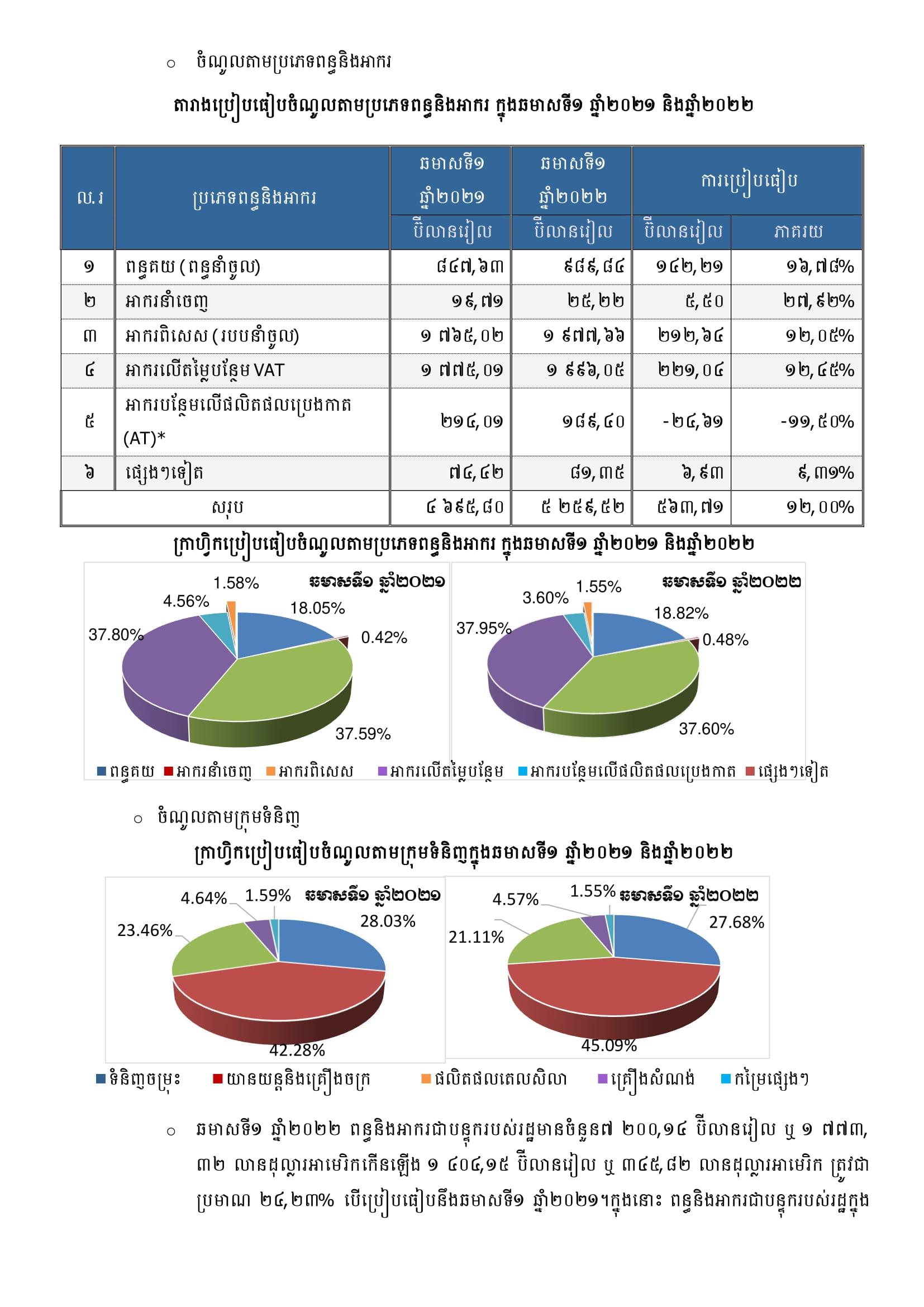 សូមជម្រាបថា ទំហំពាណិជ្ជកម្មនៃការនាំចូលសរុប ដោយមិនរាប់បញ្ជូលនូវការនាំចូលមាស ក្នុងឆមាសទី១ ឆ្នាំ២០២២ មានតម្លៃ ១៣ ០១១.៤៣លានដុល្លារ កើនឡើង២២៩៥.៩៥លានដុល្លារអាមេរិក ឬ២១.៤៣ភាគរយ បើធៀបនឹងឆមាសទី១ ឆ្នាំ២០២១។