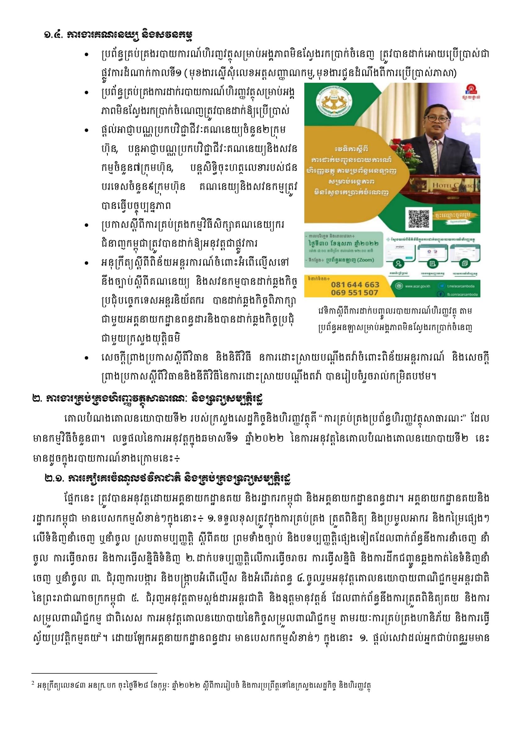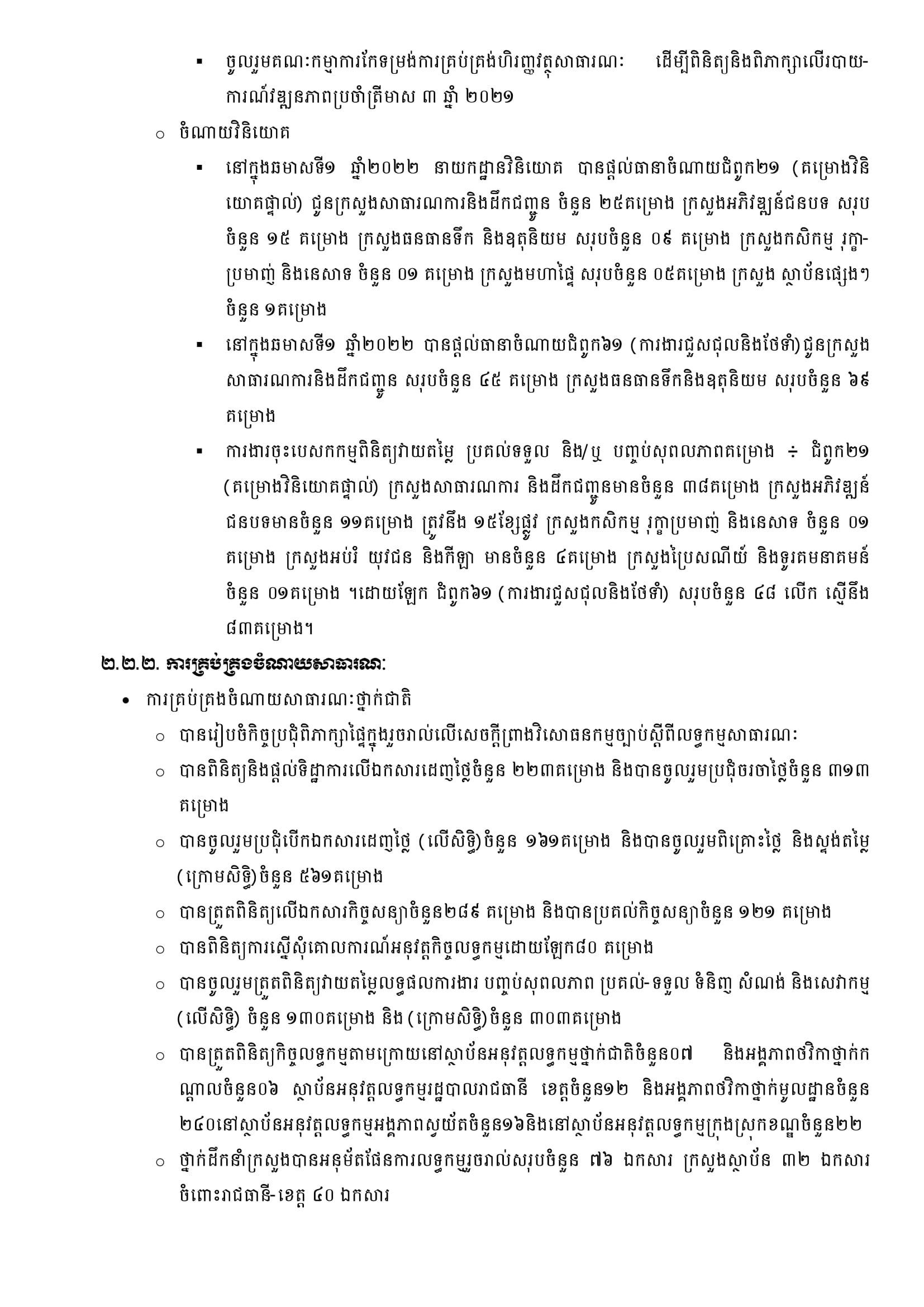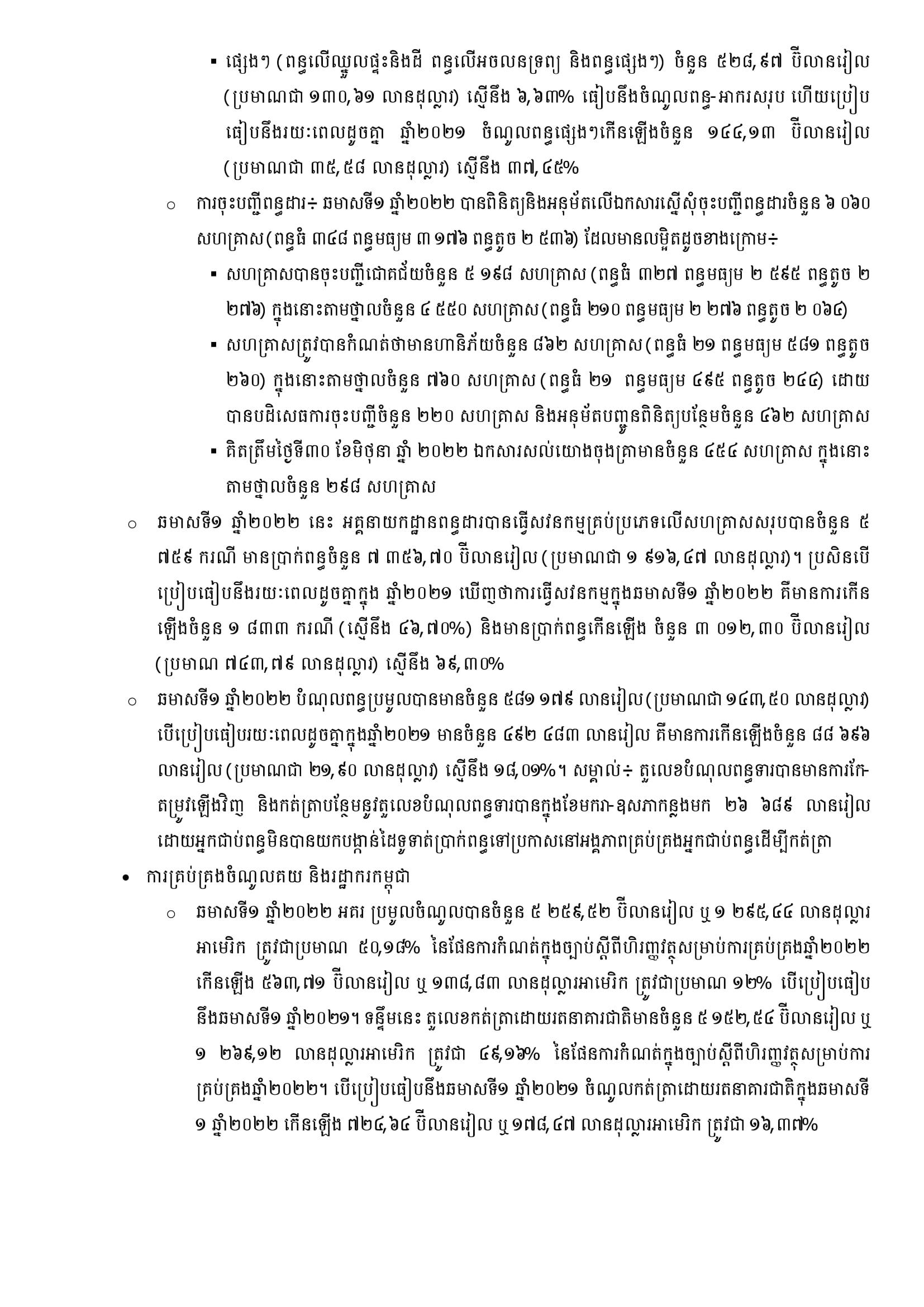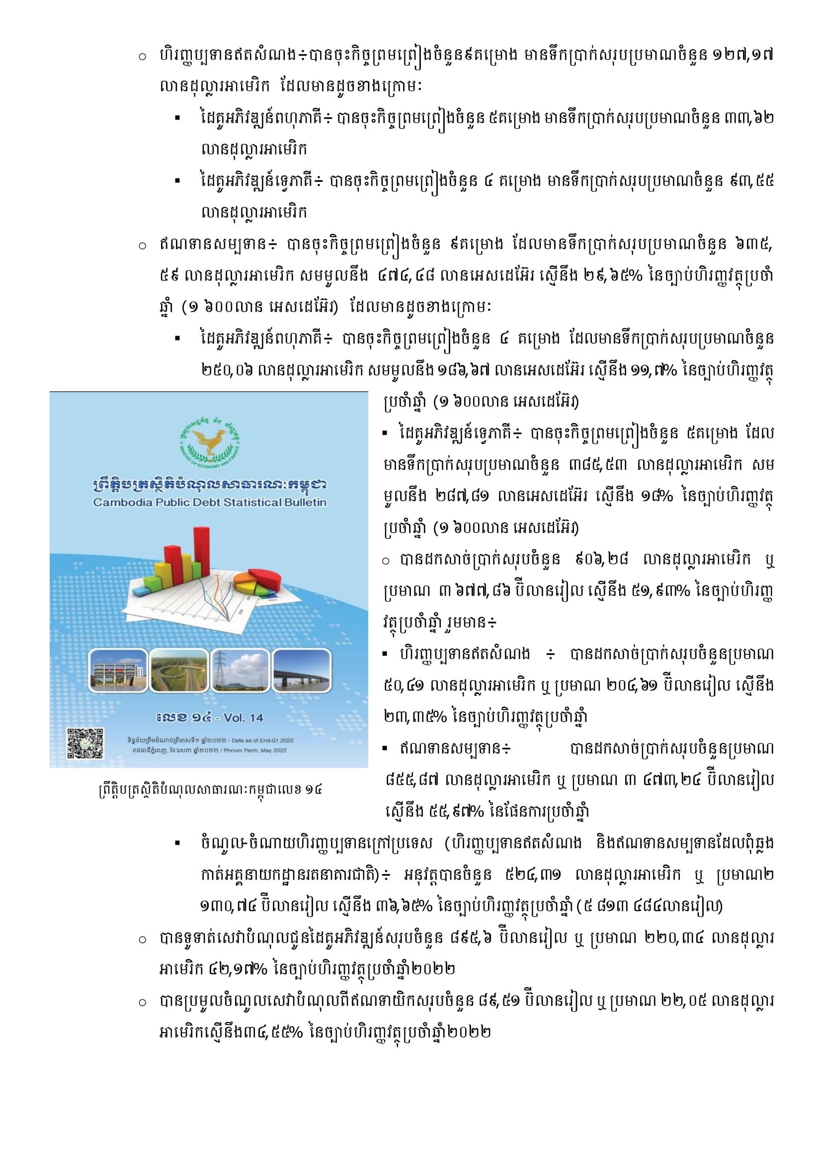 សូមជម្រាបថា ទំហំពាណិជ្ជកម្មនៃការនាំចូលសរុប ដោយមិនរាប់បញ្ជូលនូវការនាំចូលមាស ក្នុងឆមាសទី១ ឆ្នាំ២០២២ មានតម្លៃ ១៣ ០១១.៤៣លានដុល្លារ កើនឡើង២២៩៥.៩៥លានដុល្លារអាមេរិក ឬ២១.៤៣ភាគរយ បើធៀបនឹងឆមាសទី១ ឆ្នាំ២០២១។