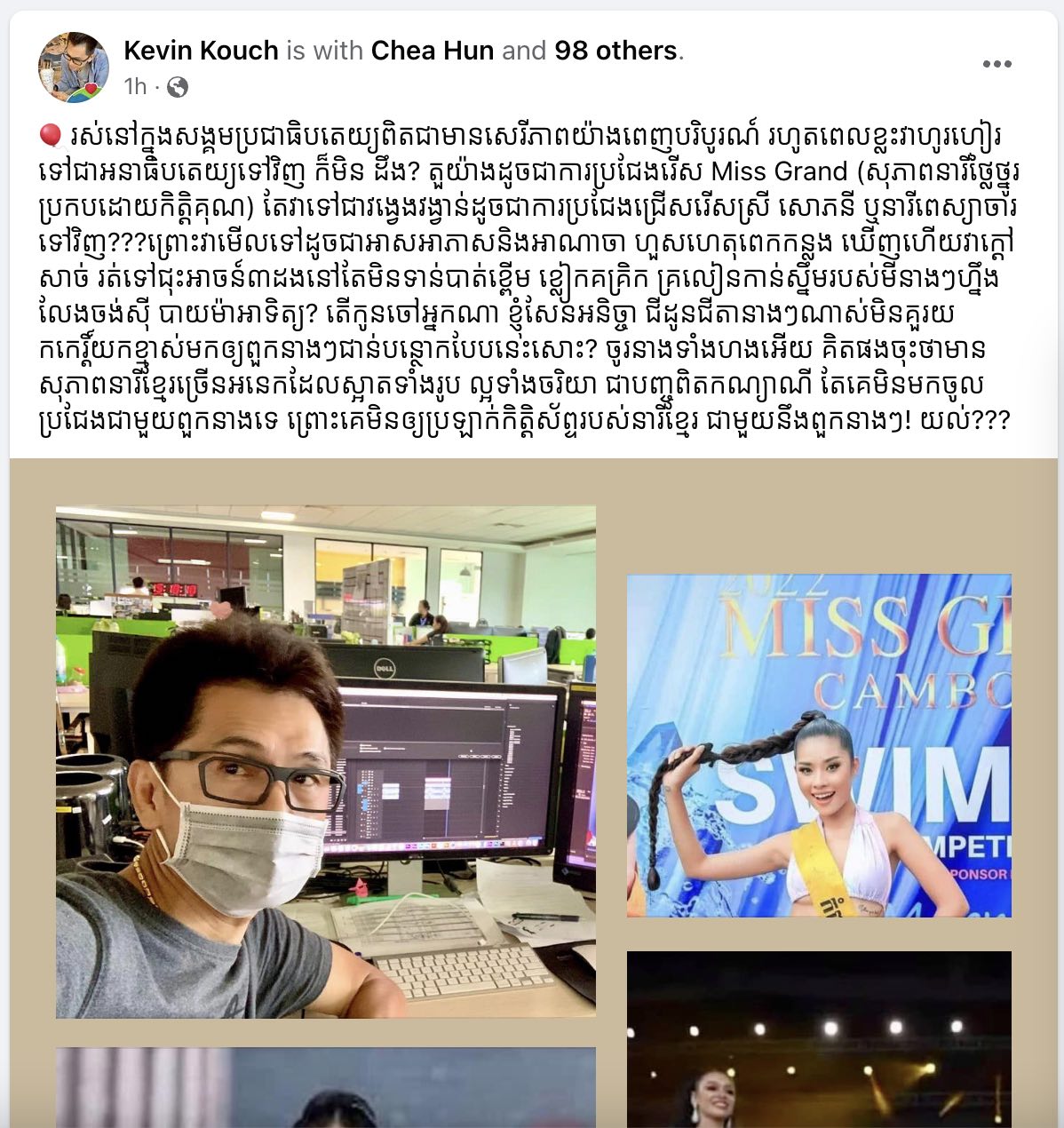 លោក គួច ខេវិន ដែលជាផលិតករដ៏ល្បីមួយរូបនៅថ្ងៃទី៣០ ខែសីហា ឆ្នាំ២០២២ បានបង្ហោះសាររិះគន់ទៅលើកម្មវិធី Miss Grand Cambodia 2022 ថាមិនមែនប្រឡងជ្រើសរើសនារីសុភាពថ្លៃថ្នូរ តែបែរជាដូចការប្រជែងជ្រើសរើសស្រីសោភិនី ឬ នារីពេស្យាចារទៅវិញ ធ្វើឱ្យមហាជនមានការភ្ញាក់ផ្អើលយ៉ាងខ្លាំង។