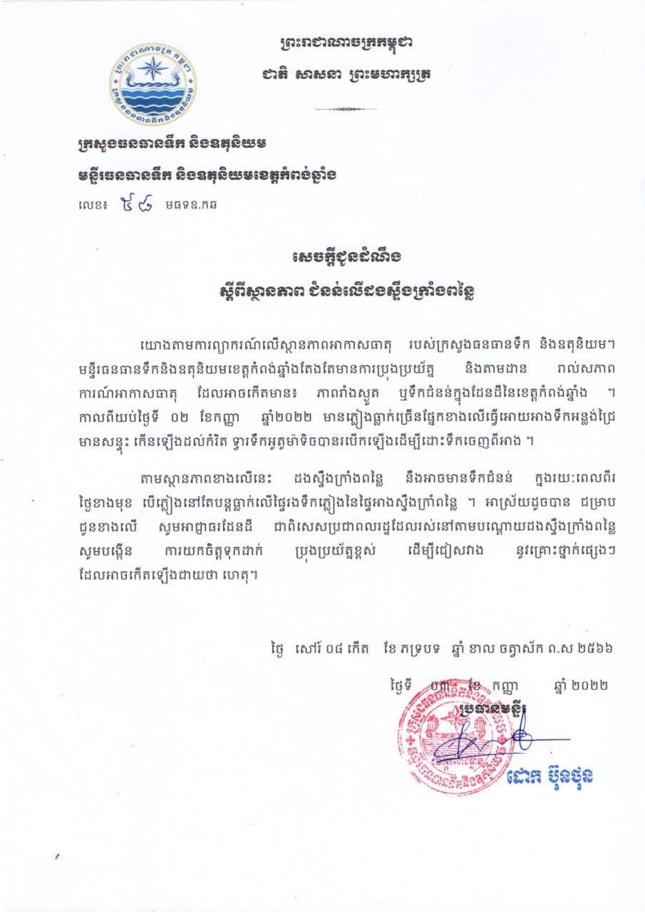 (កំពង់ឆ្នាំង)៖ ប្រធានមន្ទីរធនធានទឹក និងឧតុនិយម ខេត្តកំពង់ឆ្នាំង លោក ដោក ប៊ុនថុន នៅថ្ងៃទី៣ ខែកញ្ញា ឆ្នាំ២០២២នេះ បានចេញសេចក្តីជូនដំណឹងមួយដោយអំពាវនាវឲ្យអាជ្ញាធរ ជាពិសេសបងប្អូនប្រជាពលរដ្ឋរស់នៅ តាមដងស្ទឹងក្រាំងពន្លៃ បង្កើនការប្រុងប្រយ័ត្នខ្ពស់ដោយសារតែមានភ្លៀងធ្លាក់ខ្លាំងនៅផ្នែកខាងលើអាងទឹកអន្លង់ជ្រៃ រហូតទ្វារបើកដោយស្វ័យប្រវត្តិទៀតផង។