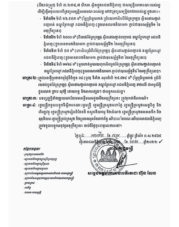 (ភ្នំពេញ)៖ ឧកញ៉ា ព្រាប សុវត្ថិ តារាចម្រៀងដ៏ល្បីឈ្មោះនៅក្នុងប្រទេសកម្ពុជា ត្រូវបានរាជរដ្ឋាភិបាលកម្ពុជាសម្រេចកាត់ផ្ទៃដីចំនួន ៤ទីតាំង ស្ថិតនៅសង្កាត់ពញាពន់ ខណ្ឌព្រែកព្នៅ រាជធានីភ្នំពេញ ដែលមានទំហំសរុប ២៩ ៨១៤ម៉ែត្រក្រឡា ចេញពីផ្ទៃបឹងតាមោក ( បឹងកប់ស្រូវ ) ធ្វើអនុបយោគ ពីទ្រព្យសម្បត្តិសាធារណៈរបស់រដ្ឋ ទៅជាទ្រព្យសម្បត្តិឯកជនរបស់រដ្ឋ ។ នេះបើយោងតាមអនុក្រឹត្យលេខ ៧៥អនក្រ.បក ចុះថ្ងៃទី១៣ ខែមេសា ឆ្នាំ២០២២ ដែលត្រូវបានគេចែកចាយពេញបណ្តាញសង្គម ហ្វេសប៊ុក។