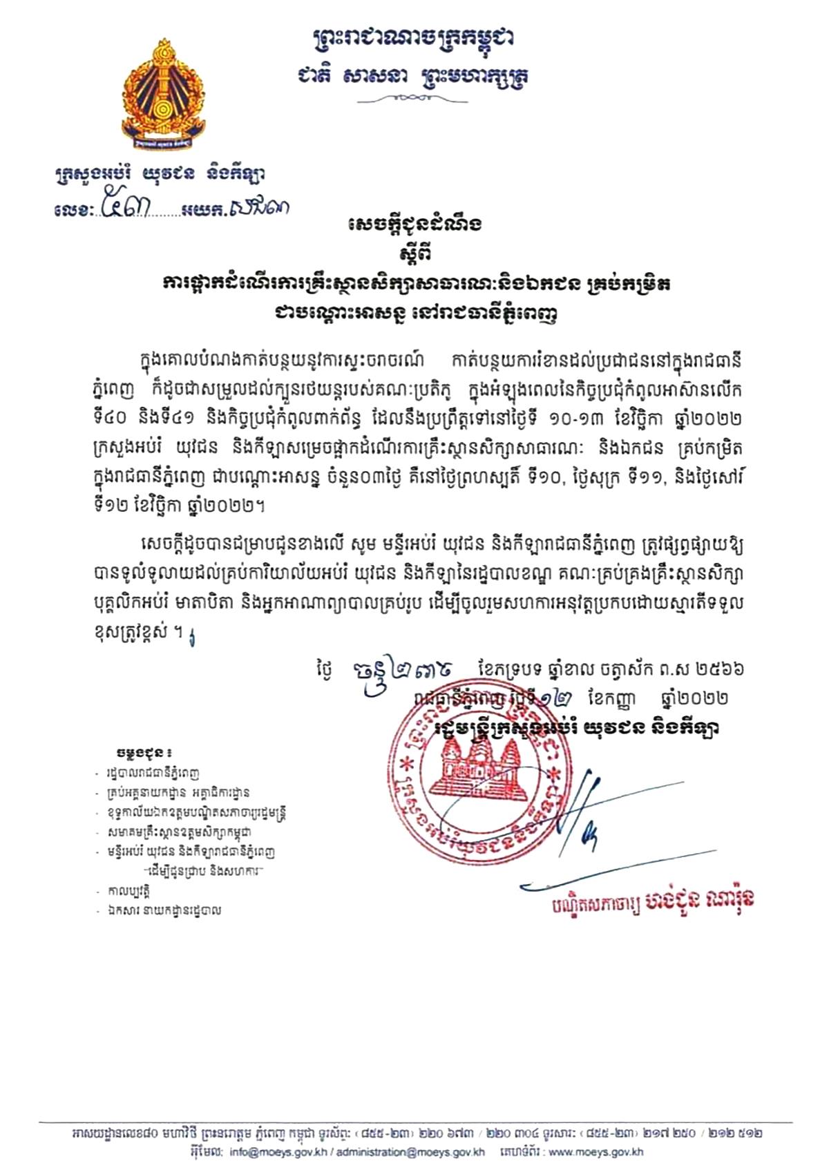ខាងក្រោមនេះ ជាសេចក្តីជូនដំណឹងរបស់ក្រសួងអប់រំ យុវជន និងកីឡា៖